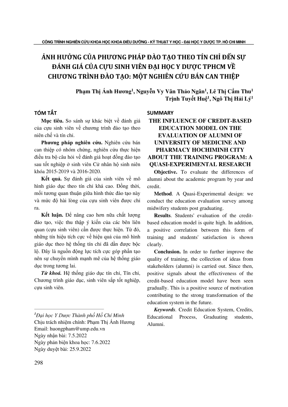 So sánh sự khác biệt về đánh giá của cựu sinh viên về chương trình đào tạo theo niên chế và tín chỉ. Phương pháp nghiên cứu. Nghiên cứu bán can thiệp có nhóm chứng, nghiên cứu thực hiện điều tra bộ câu hỏi về đánh giá hoạt đồng đào tạo sau tốt nghiệp ở sinh viên Cử nhân hộ sinh niên khóa 2015-2019 và 2016-2020. Kết quả. Sự đánh giá của sinh viên về mô hình giáo dục theo tín chỉ khá cao. Đồng thời, mối tương quan thuận giữa hình thức đào tạo này và mức độ hài lòng của cựu sinh viên được chỉ ra. Kết luận. Để nâng cao hơn nữa chất lượng đào tạo, việc thu thập ý kiến của các bên liên quan (cựu sinh viên) cần được thực hiện. Từ đó, những tín hiệu tích cực về hiệu quả của mô hình giáo dục theo hệ thống tín chỉ đã dần được bộc lộ. Đây là nguồn động lực tích cực góp phần tạo nên sự chuyển mình mạnh mẽ của hệ thống giáo dục trong tương lai.