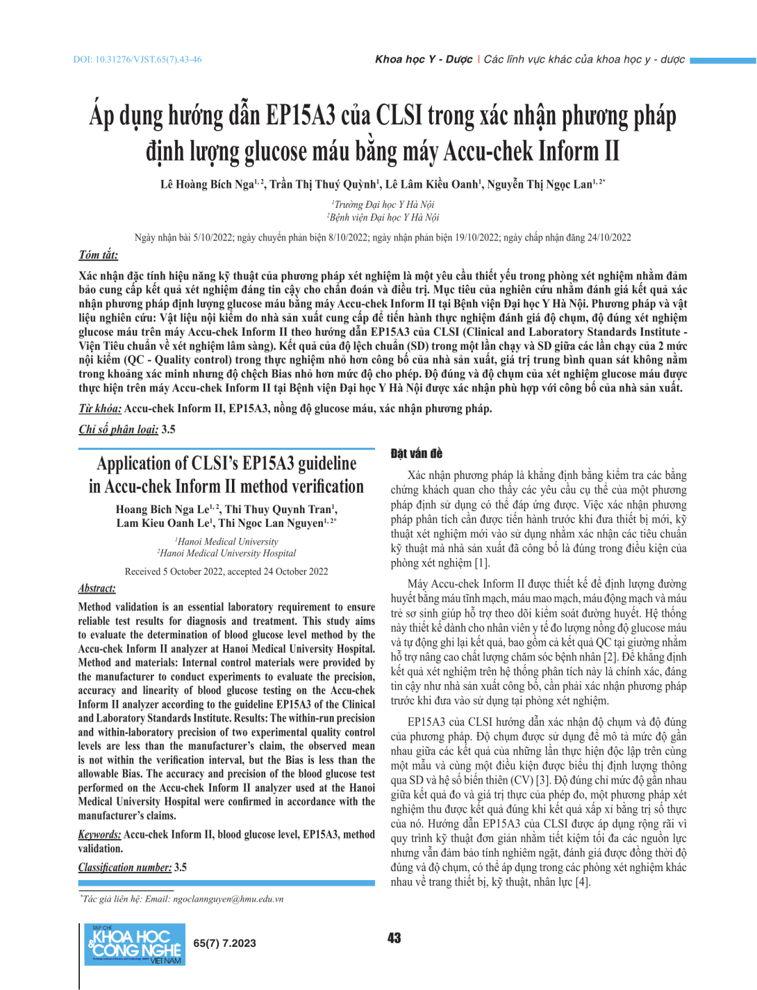 Xác nhận đặc tính hiệu năng kỹ thuật của phương pháp xét nghiệm là một yêu cầu thiết yếu trong phòng xét nghiệm nhằm đảm bảo cung cấp kết quả xét nghiệm đáng tin cậy cho chẩn đoán và điều trị. Đánh giá kết quả xác nhận phương pháp định lượng glucose máu bằng máy Accu-chek Inform II tại Bệnh viện Đại học Y Hà Nội. Vật liệu nội kiểm do nhà sản xuất cung cấp để tiến hành thực nghiệm đánh giá độ chụm, độ đúng xét nghiệm glucose máu trên máy Accu-chek Inform II theo hướng dẫn EP15A3 của CLSI (Clinical and Laboratory Standards Institute - Viện Tiêu chuẩn về xét nghiệm lâm sàng). Kết quả của độ lệch chuẩn (SD) trong một lần chạy và SD giữa các lần chạy của 2 mức nội kiểm (QC - Quality control) trong thực nghiệm nhỏ hơn công bố của nhà sản xuất, giá trị trung bình quan sát không nằm trong khoảng xác minh nhưng độ chệch Bias nhỏ hơn mức độ cho phép. Độ đúng và độ chụm của xét nghiệm glucose máu được thực hiện trên máy Accu-chek Inform II tại Bệnh viện Đại học Y Hà Nội được xác nhận phù hợp với công bố của nhà sản xuất.