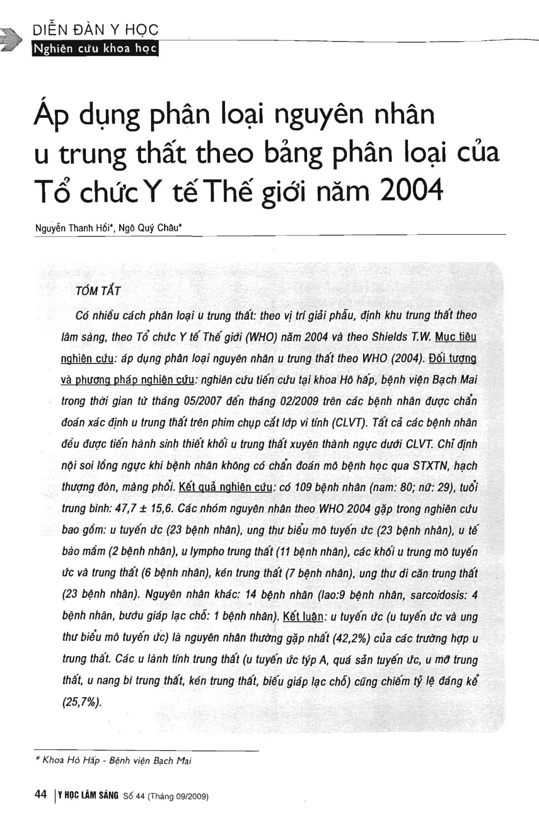 áp dụng phân loại nguyên nhân u trung thất theo bảng phân loại của Tổ chức Y tế Thế giới năm 2004