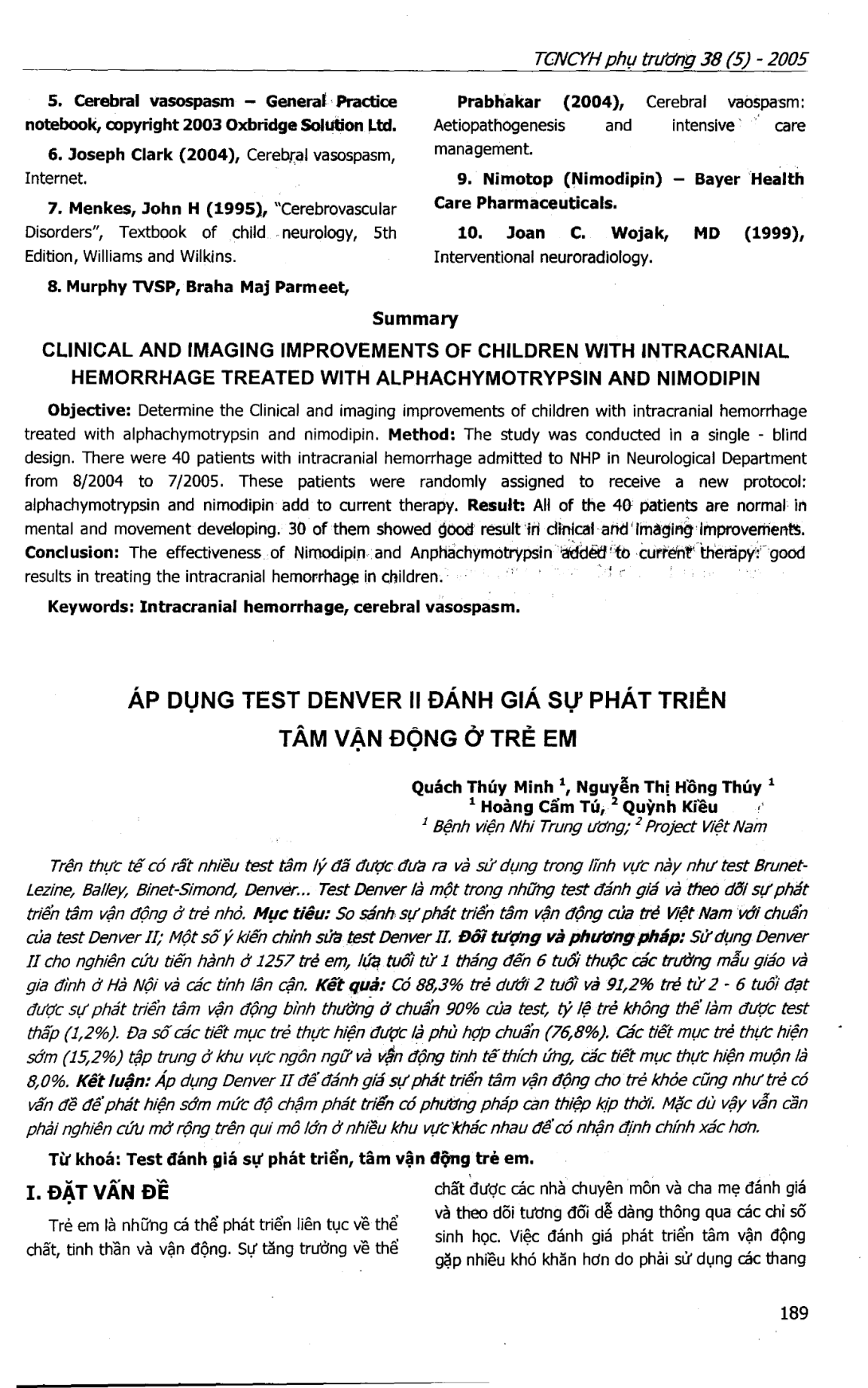 So sánh sự phát triển tâm vận động của trẻ em Việt Nam với chuẩn của Test Denver II và đề xuất một số ý kiến chỉnh sửa Test Denver II. Có 88,3% trẻ em dưới 2 tuổi và 91,22% trẻ từ 2 đến 6 tuổi đạt sự phát triển tâm vận động bình thường ở chuẩn 90% của Test. Tỷ lệ trẻ không thể làm được Test chỉ chiếm 1,2% .