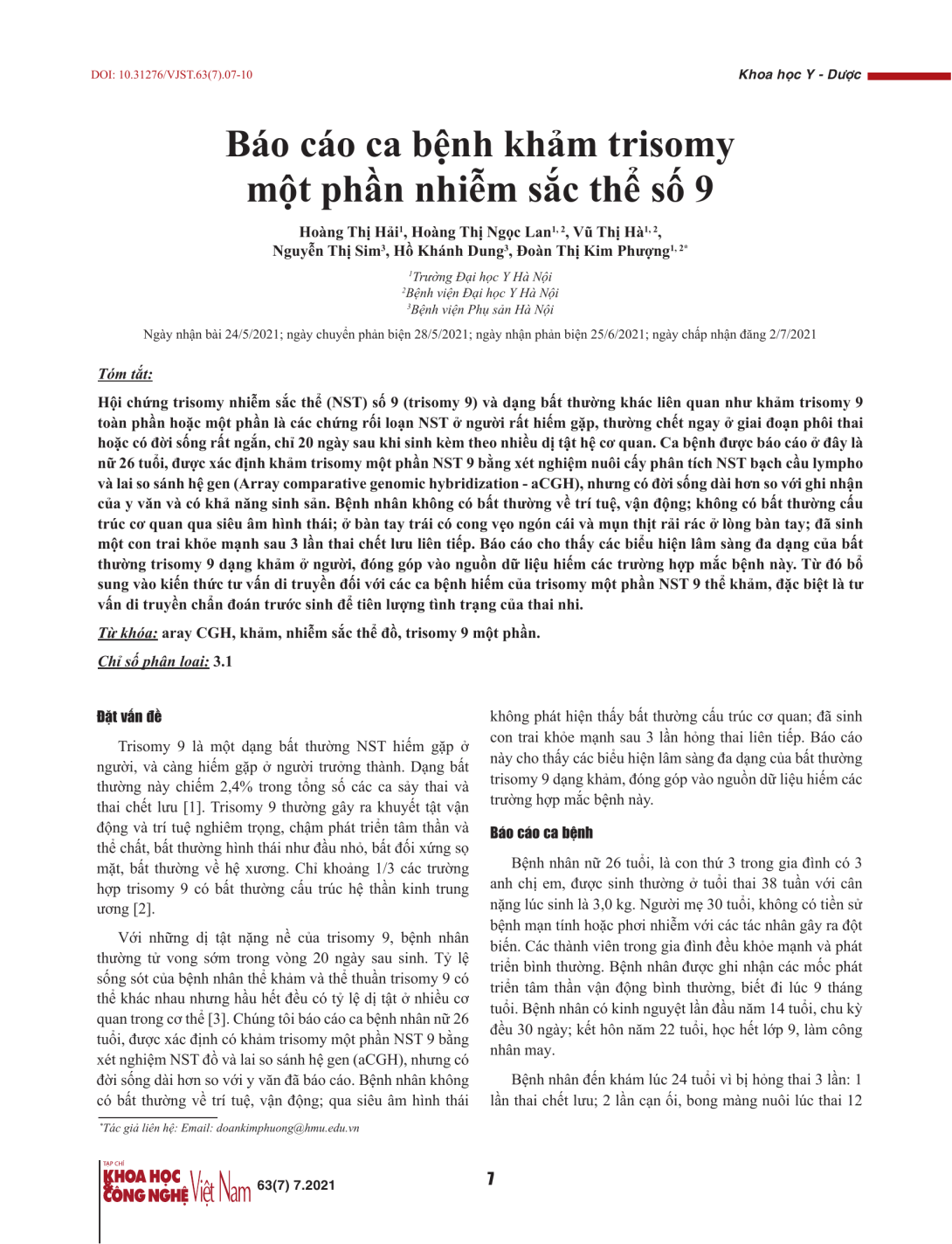 Hội chứng trisomy nhiễm sắc thể (NST) số 9 (trisomy 9) và dạng bất thường khác liên quan như khảm trisomy 9 toàn phần hoặc một phần là các chứng rối loạn NST ở người rất hiếm gặp, thường chết ngay ở giai đoạn phôi thai hoặc có đời sống rất ngắn, chỉ 20 ngày sau khi sinh kèm theo nhiều dị tật hệ cơ quan. Ca bệnh được báo cáo ở đây là nữ 26 tuổi, được xác định khảm trisomy một phần NST 9 bằng xét nghiệm nuôi cấy phân tích NST bạch cầu lympho và lai so sánh hệ gen (Array comparative genomic hybridization - aCGH), nhưng có đời sống dài hơn so với ghi nhận của y văn và có khả năng sinh sản. Bệnh nhân không có bất thường về trí tuệ, vận động; không có bất thường cấu trúc cơ quan qua siêu âm hình thái; ở bàn tay trái có cong vẹo ngón cái và mụn thịt rải rác ở lòng bàn tay; đã sinh một con trai khỏe mạnh sau 3 lần thai chết lưu liên tiếp. Báo cáo cho thấy các biểu hiện lâm sàng đa dạng của bất thường trisomy 9 dạng khảm ở người, đóng góp vào nguồn dữ liệu hiếm các trường hợp mắc bệnh này. Từ đó bổ sung vào kiến thức tư vấn di truyền đối với các ca bệnh hiếm của trisomy một phần NST 9 thể khảm, đặc biệt là tư vấn di truyền chẩn đoán trước sinh để tiên lượng tình trạng của thai nhi.
