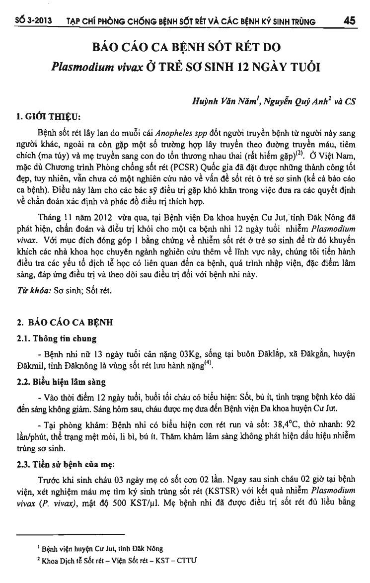 Malaria is spread from person to person by female Anopheles spp mosquitoes. It is also transmitted through blood transfusion, injection (drug) and mother-to-child transmission due to injuried placenta (rarely) (2). In Vietnam, although the National Malaria Prevention Programme has obtained great achievements, there has been no research on the issue of malaria in infants (including case reports). This prevents physicians from'making decisions about diagnosis and determination of the appropriate treatment regimen. A case of 12-day-old patient infected with Plasmodium vivax was diagnosed and successfully treated at Cu Jut General Hospital, Cu Jut district, Dak Nong province in November 2012. For the purpose of contributing evidence of malaria infection in infants from which encouraging specialized scientists to carry out further study, the authors investigated the epidemiological factors related to the case, admission process, clinical characteristics, treatment responses and follow-up treatment for this patient.
