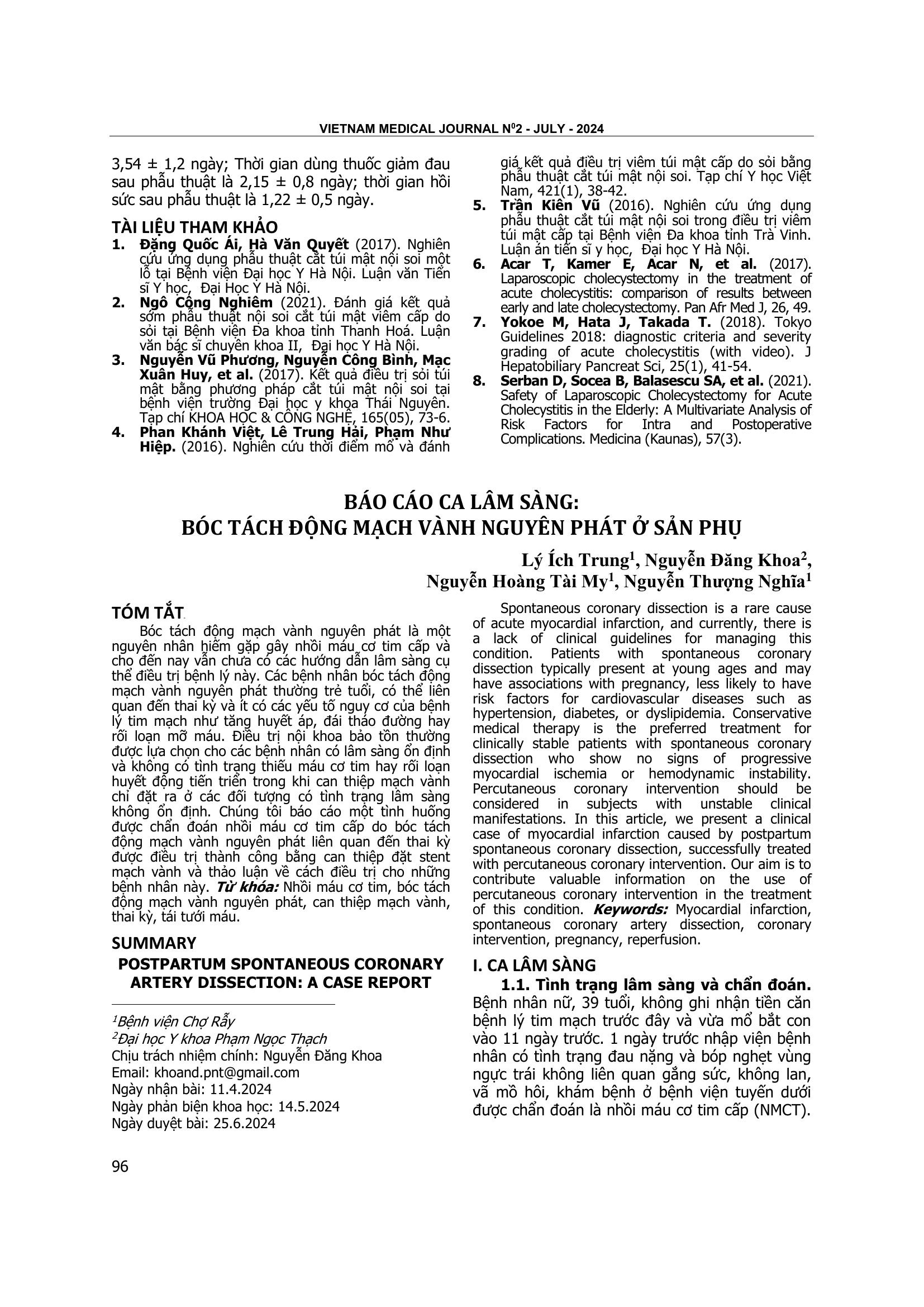 Bóc tách động mạch vành nguyên phát là một nguyên nhân hiếm gặp gây nhồi máu cơ tim cấp và cho đến nay vẫn chưa có các hướng dẫn lâm sàng cụ thể điều trị bệnh lý này. Các bệnh nhân bóc tách động mạch vành nguyên phát thường trẻ tuổi, có thể liên quan đến thai kỳ và ít có các yếu tố nguy cơ của bệnh lý tim mạch như tăng huyết áp, đái tháo đường hay rối loạn mỡ máu. Điều trị nội khoa bảo tồn thường được lựa chọn cho các bệnh nhân có lâm sàng ổn định và không có tình trạng thiếu máu cơ tim hay rối loạn huyết động tiến triển trong khi can thiệp mạch vành chỉ đặt ra ở các đối tượng có tình trạng lâm sàng không ổn định. Chúng tôi báo cáo một tình huống được chẩn đoán nhồi máu cơ tim cấp do bóc tách động mạch vành nguyên phát liên quan đến thai kỳ được điều trị thành công bằng can thiệp đặt stent mạch vành và thảo luận về cách điều trị cho những bệnh nhân này.
