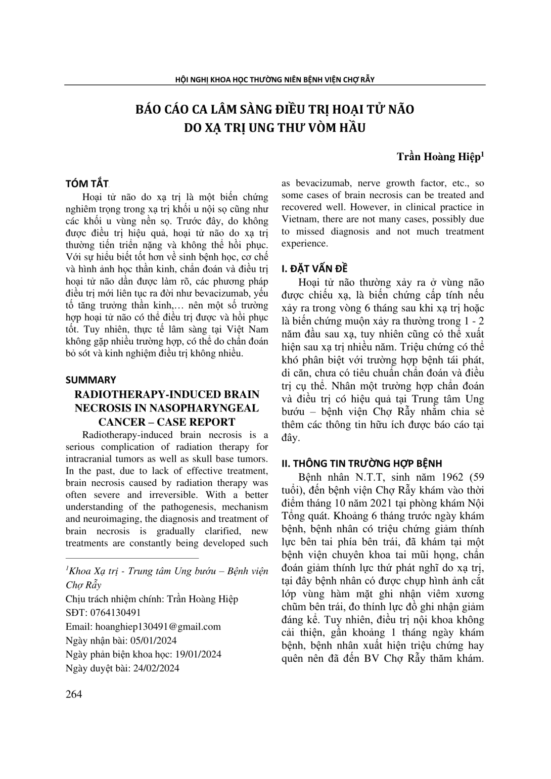 Hoại tử não do xạ trị là một biến chứng nghiêm trọng trong xạ trị khối u nội sọ cũng như các khối u vùng nền sọ. Trước đây, do không được điều trị hiệu quả, hoại tử não do xạ trị thường tiến triển nặng và không thể hồi phục. Với sự hiểu biết tốt hơn về sinh bệnh học, cơ chế và hình ảnh học thần kinh, chẩn đoán và điều trị hoại tử não dần được làm rõ, các phương pháp điều trị mới liên tục ra đời như bevacizumab, yếu tố tăng trưởng thần kinh,… nên một số trường hợp hoại tử não có thể điều trị được và hồi phục tốt. Tuy nhiên, thực tế lâm sàng tại Việt Nam không gặp nhiều trường hợp, có thể do chẩn đoán bỏ sót và kinh nghiệm điều trị không nhiều.