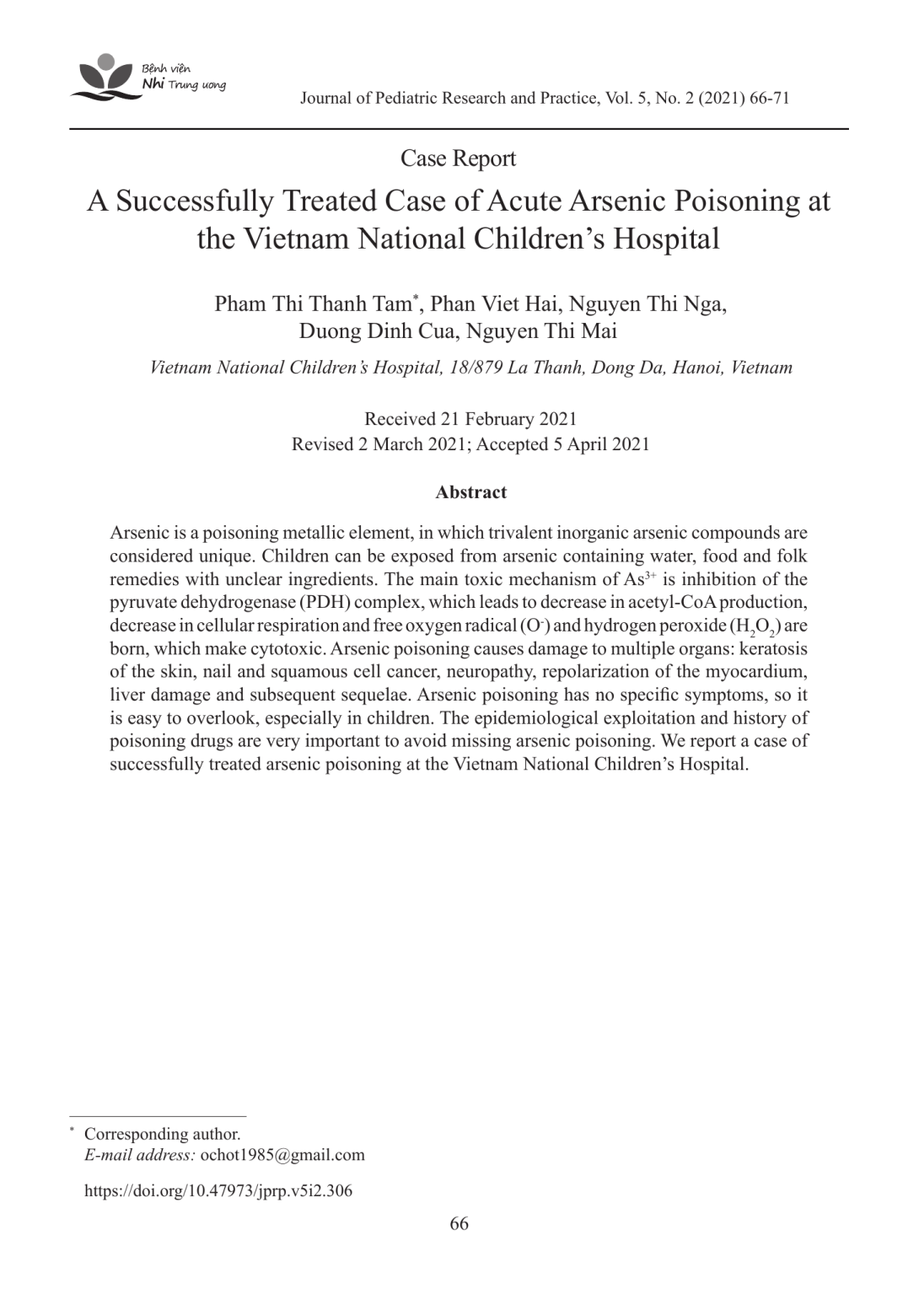 Asen là một á kim gây ngộ độc, trong đó, hợp chất asen vô cơ hóa trị ba được coi là độc nhất. Trẻ em có thể bị phơi nhiễm từ nguồn nước, thực phẩm và bài thuốc dân gian chứa asen. Cơ chế gây độc chính của As3+ là ức chế phức hợp pyruvate ehydrogenase (PDH), dẫn tới giảm sản xuất acetyl-CoA, giảm hô hấp tế bào và sinh các gốc oxygen tự do (O-) và hydrogen peroxide (H2O2) gây độc tế bào. Ngộ độc asen gây tổn thương đa cơ quan sừng hóa da, móng và ung thư tế bào gai, bệnh lý thần kinh, rối loạn tái cực của cơ tim, tổn thương gan và để lại nhiều di chứng sau này. Ngộ độc asen không có triệu chứng đặc hiệu nên rất dễ bỏ sót đặc biệt ở trẻ em. Việc khai thác dịch tễ, tiền sử dùng thuốc gây ngộ độc rất quan trọng để tránh bỏ sót ngộ độc asen. Chúng tôi báo cáo một trường hợp ngộ độc cấp asen điều trị thành công tại Bệnh viện Nhi Trung ương.
