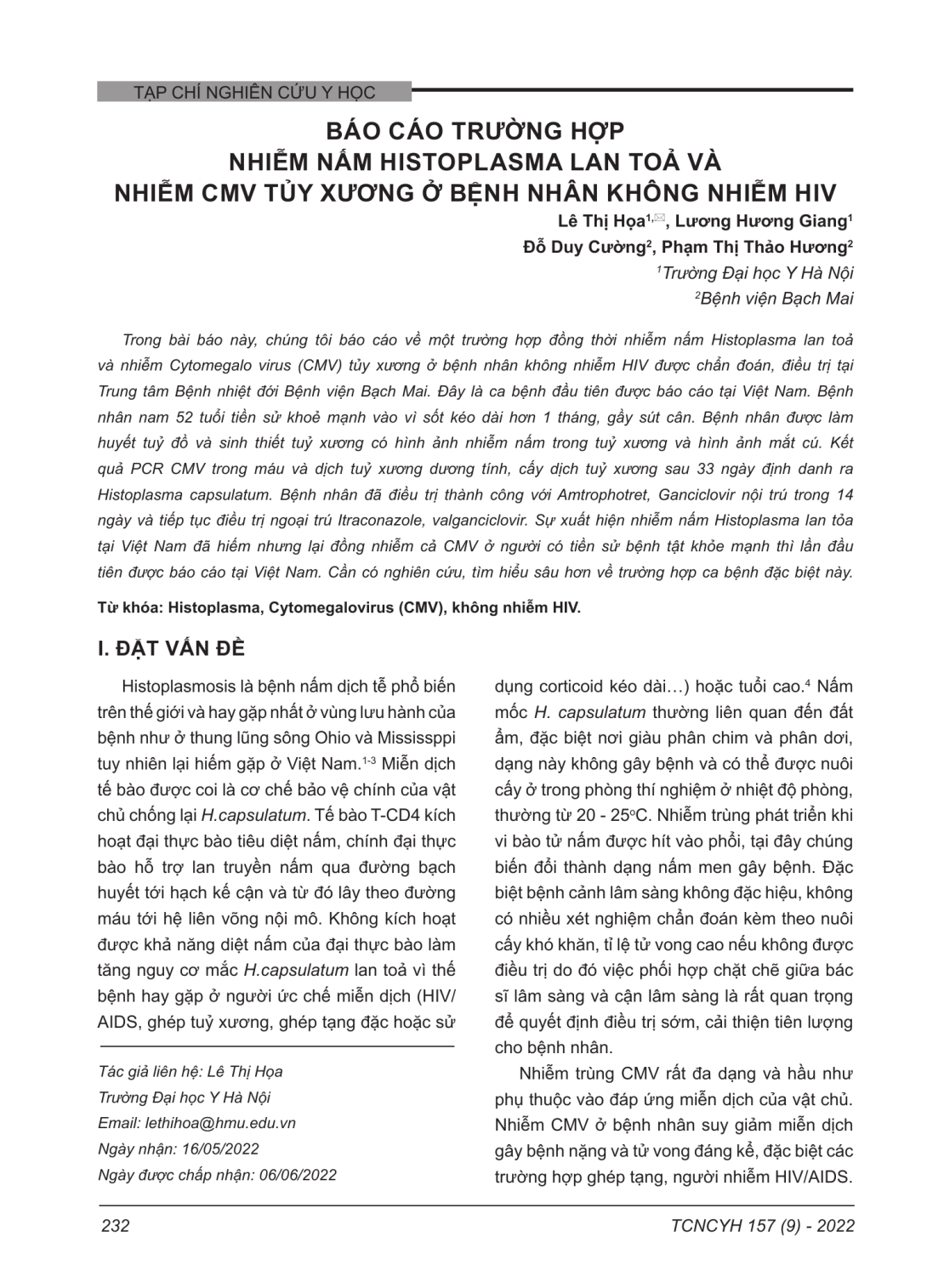 Trong bài báo này, chúng tôi báo cáo về một trường hợp đồng thời nhiễm nấm Histoplasma lan toả và nhiễm Cytomegalo virus (CMV) tủy xương ở bệnh nhân không nhiễm HIV được chẩn đoán, điều trị tại Trung tâm Bệnh nhiệt đới Bệnh viện Bạch Mai. Đây là ca bệnh đầu tiên được báo cáo tại Việt Nam. Bệnh nhân nam 52 tuổi tiền sử khoẻ mạnh vào vì sốt kéo dài hơn 1 tháng, gầy sút cân. Bệnh nhân được làm huyết tuỷ đồ và sinh thiết tuỷ xương có hình ảnh nhiễm nấm trong tuỷ xương và hình ảnh mắt cú. Kết quả PCR CMV trong máu và dịch tuỷ xương dương tính, cấy dịch tuỷ xương sau 33 ngày định danh ra Histoplasma capsulatum. Bệnh nhân đã điều trị thành công với Amtrophotret, Ganciclovir nội trú trong 14 ngày và tiếp tục điều trị ngoại trú Itraconazole, valganciclovir. Sự xuất hiện nhiễm nấm Histoplasma lan tỏa tại Việt Nam đã hiếm nhưng lại đồng nhiễm cả CMV ở người có tiền sử bệnh tật khỏe mạnh thì lần đầu tiên được báo cáo tại Việt Nam. Cần có nghiên cứu, tìm hiểu sâu hơn về trường hợp ca bệnh đặc biệt này.