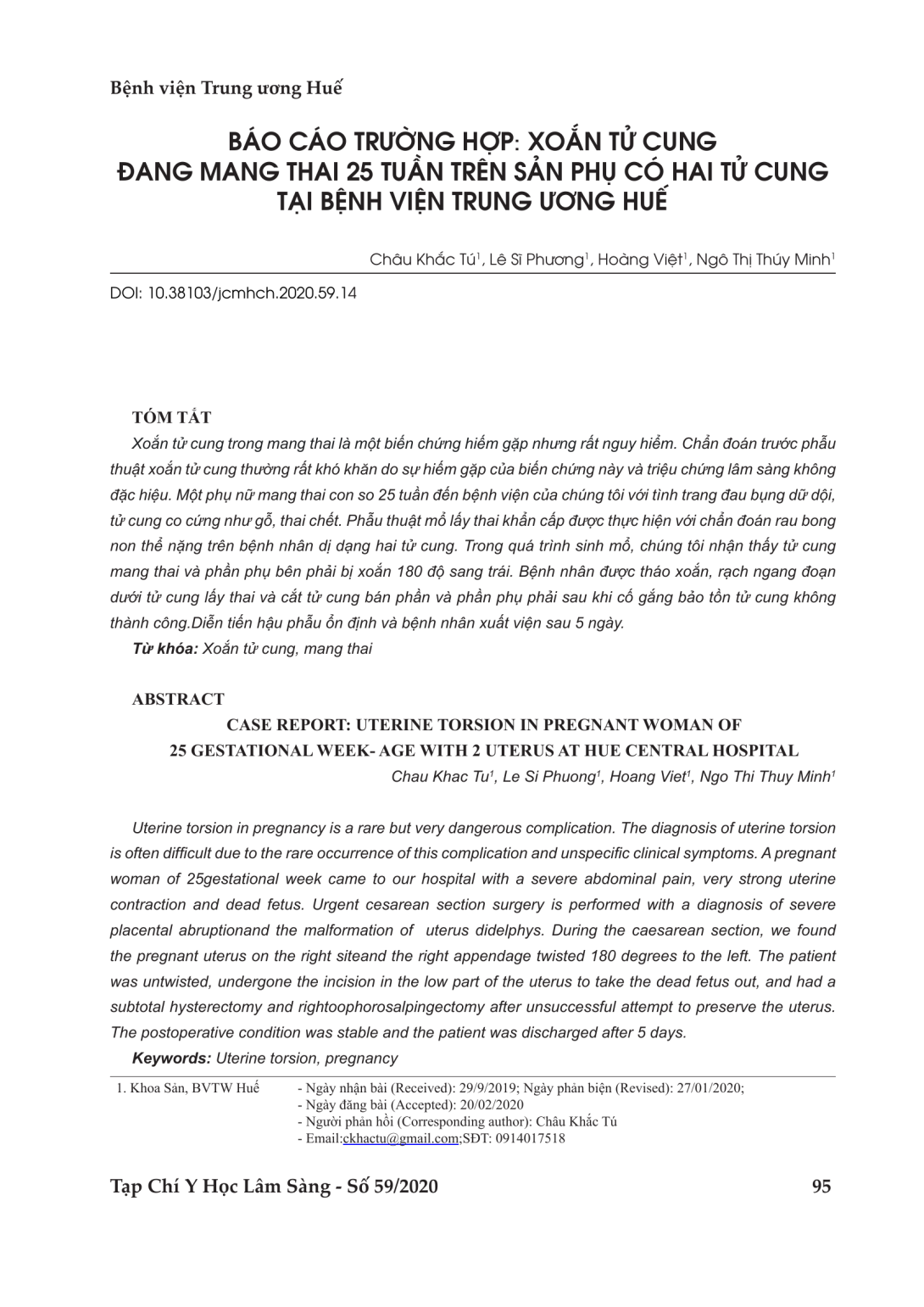 Xoắn tử cung trong mang thai là một biến chứng hiếm gặp nhưng rất nguy hiểm. Chẩn đoán trước phẫu thuật xoắn tử cung thường rất khó khăn do sự hiếm gặp của biến chứng này và triệu chứng lâm sàng không đặc hiệu. Một phụ nữ mang thai con so 25 tuần đến bệnh viện của chúng tôi với tình trang đau bụng dữ dội, tử cung co cứng như gỗ, thai chết. Phẫu thuật mổ lấy thai khẩn cấp được thực hiện với chẩn đoán rau bong non thể nặng trên bệnh nhân dị dạng hai tử cung. Trong quá trình sinh mổ, chúng tôi nhận thấy tử cung mang thai và phần phụ bên phải bị xoắn 180 độ sang trái. Bệnh nhân được tháo xoắn, rạch ngang đoạn dưới tử cung lấy thai và cắt tử cung bán phần và phần phụ phải sau khi cố gắng bảo tồn tử cung không thành công.Diễn tiến hậu phẫu ổn định và bệnh nhân xuất viện sau 5 ngày.