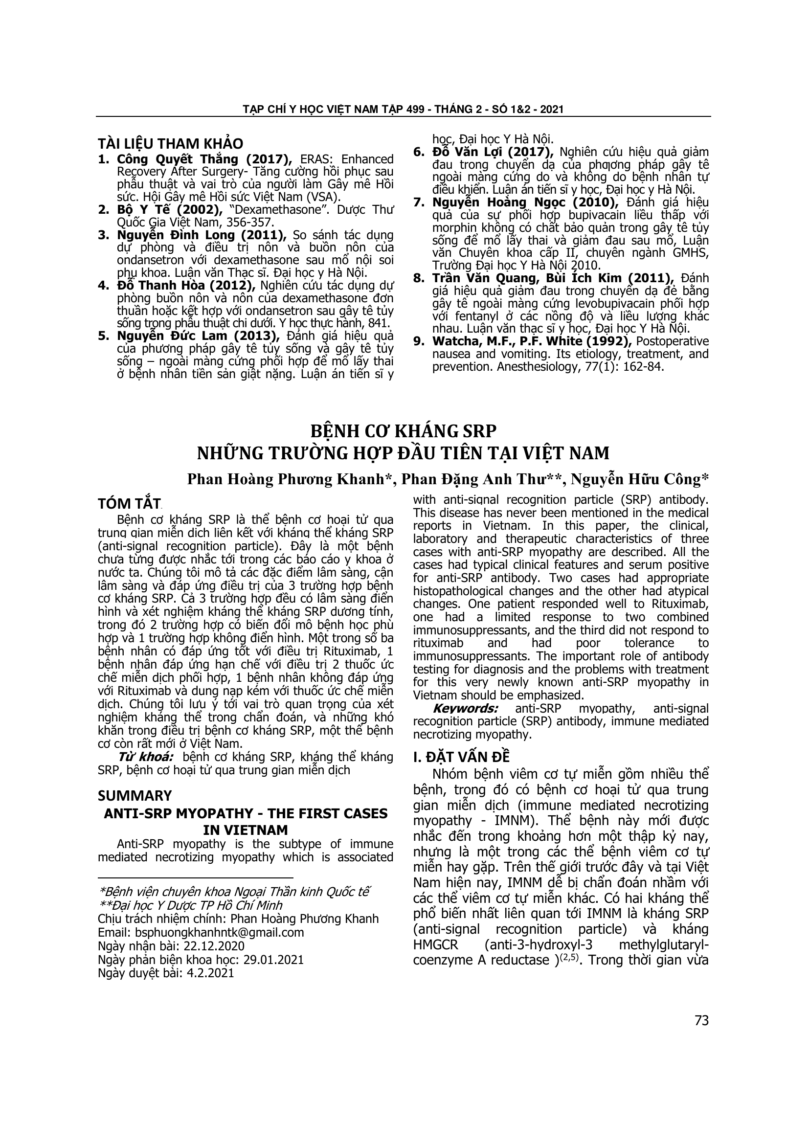 Bệnh cơ kháng SRP là thể bệnh cơ hoại tử qua trung gian miễn dịch liên kết với kháng thể kháng SRP (anti-signal recognition particle). Đây là một bệnh chưa từng được nhắc tới trong các báo cáo y khoa ở nước ta. Chúng tôi mô tả các đặc điểm lâm sàng, cận lâm sàng và đáp ứng điều trị của 3 trường hợp bệnh cơ kháng SRP. Cả 3 trường hợp đều có lâm sàng điển hình và xét nghiệm kháng thể kháng SRP dương tính, trong đó 2 trường hợp có biến đổi mô bệnh học phù hợp và 1 trường hợp không điển hình. Một trong số ba bệnh nhân có đáp ứng tốt với điều trị Rituximab, 1 bệnh nhân đáp ứng hạn chế với điều trị 2 thuốc ức chế miễn dịch phối hợp, 1 bệnh nhân không đáp ứng với Rituximab và dung nạp kém với thuốc ức chế miễn dịch. Chúng tôi lưu ý tới vai trò quan trọng của xét nghiệm kháng thể trong chẩn đoán, và những khó khăn trong điều trị bệnh cơ kháng SRP, một thể bệnh cơ còn rất mới ở Việt Nam.