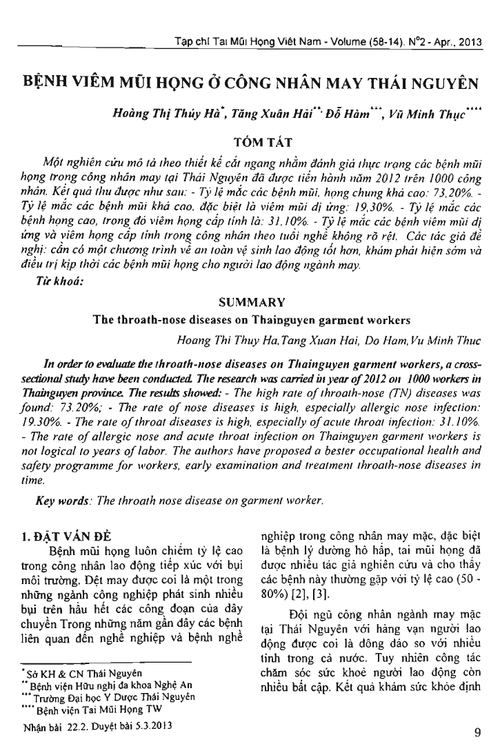 In order to evaluate the throath-nose diseases on Thai Nguyen garment workers, a cross sectional study have been conducted. The research was carried in year of 2012 on 1000 workers in Thai Nguyen province. The results showed: - The high rate of throath-nose (TN) diseases was found: 73.20 percent; - The rate of nose diseases is high, especially allergic nose infection: 19.30 percent. - The rate of throat diseases is high, especially of acute throat infection: 31.10 percent. - The rate of allergic nose and acute throat infection on Thai Nguyen garment workers is not logical to years of labor. The authors have proposed a bester occupational health and safety programme for workers, early examination and treatment throath-nose diseases in time.