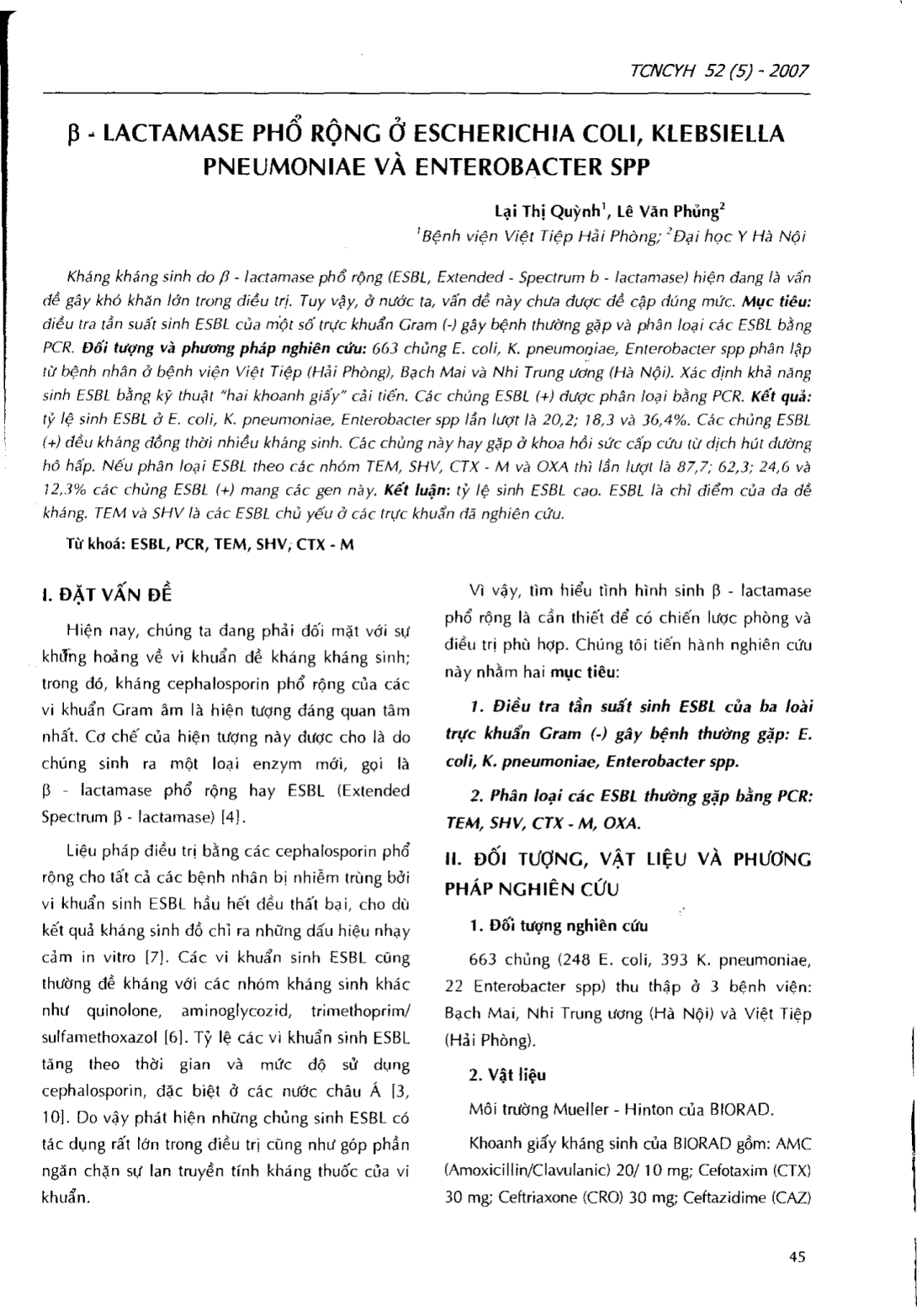 Bêta –Lactamase phổ rộng ở Escherichia Coli, Klebsiella Pneumoniae và Enterobacter SPP