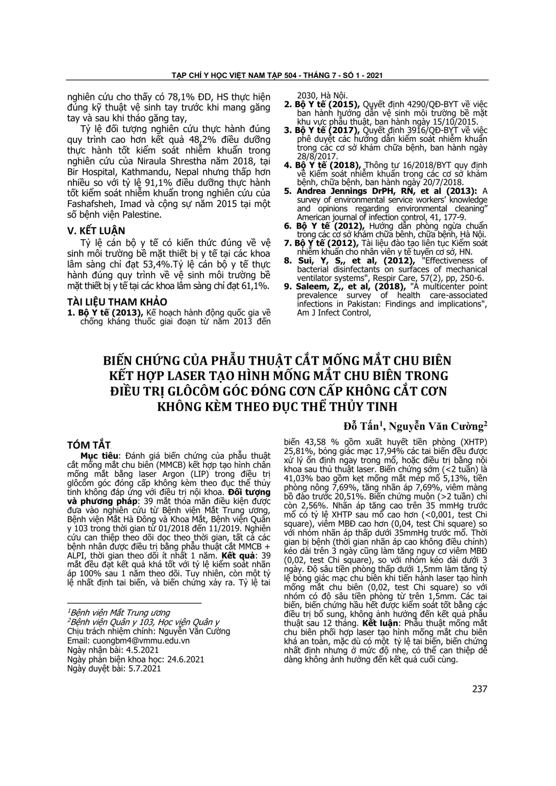 Đánh giá biến chứng của phẫu thuật cắt mống mắt chu biên (MMCB) kết hợp tạo hình chân mống mắt bằng laser Argon (LIP) trong điều trị glôcôm góc đóng cấp không kèm theo đục thể thủy tinh không đáp ứng với điều trị nội khoa. Đối tượng và phương pháp: 39 mắt thỏa mãn điều kiện được đưa vào nghiên cứu từ Bệnh viện Mắt Trung ương, Bệnh viện Mắt Hà Đông và Khoa Mắt, Bệnh viện Quân y 103 trong thời gian từ 01/2018 đến 11/2019. Nghiên cứu can thiệp theo dõi dọc theo thời gian, tất cả các bệnh nhân được điều trị bằng phẫu thuật cắt MMCB + ALPI, thời gian theo dõi ít nhất 1 năm. Kết quả: 39 mắt đều đạt kết quả khá tốt với tỷ lệ kiểm soát nhãn áp 100% sau 1 năm theo dõi. Tuy nhiên, còn một tỷ lệ nhất định tai biến, và biến chứng xảy ra. Tỷ lệ tai biến 43,58 % gồm xuất huyết tiền phòng (XHTP) 25,81%, bỏng giác mạc 17,94% các tai biến đều được xử lý ổn định ngay trong mổ, hoặc điều trị bằng nội khoa sau thủ thuật laser. Biến chứng sớm (<2 tuần) là 41,03% bao gồm kẹt mống mắt mép mổ 5,13%, tiền phòng nông 7,69%, tăng nhãn áp 7,69%, viêm màng bồ đào trước 20,51%. Biến chứng muộn (>2 tuần) chỉ còn 2,56%. Nhãn áp tăng cao trên 35 mmHg trước mổ có tỷ lệ XHTP sau mổ cao hơn (<0,001, test Chi square), viêm MBĐ cao hơn (0,04, test Chi square) so với nhóm nhãn áp thấp dưới 35mmHg trước mổ. Thời gian bị bệnh (thời gian nhãn áp cao không điều chỉnh) kéo dài trên 3 ngày cũng làm tăng nguy cơ viêm MBĐ (0,02, test Chi square), so với nhóm kéo dài dưới 3 ngày. Độ sâu tiền phòng thấp dưới 1,5mm làm tăng tỷ lệ bỏng giác mạc chu biên khi tiến hành laser tạo hình mống mắt chu biên (0,02, test Chi square) so với nhóm có độ sâu tiền phòng từ trên 1,5mm. Các tai biến, biến chứng hầu hết được kiểm soát tốt bằng các điều trị bổ sung, không ảnh hưởng đến kết quả phẫu thuật sau 12 tháng. Kết luận: Phẫu thuật mống mắt chu biên phối hợp laser tạo hình mống mắt chu biên khá an toàn, mặc dù có một tỷ lệ tai biến, biến chứng nhất định nhưng ở mức độ nhẹ, có thể can thiệp dễ dàng không ảnh hưởng đến kết quả cuối cùng.