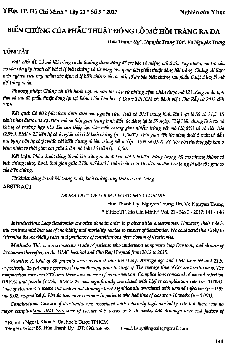 Đánh giá biến chứng của phẫu thuật đóng lỗ mở hồi tràng ra da trên 80 bệnh nhân từ 2012 đến 2015. Kết quả cho thấy phẫu thuật đóng lỗ mở hồi tràng ra da đi kèm với tỷ lệ biến chứng tương đối cao nhưng không có biến chứng nặng. BMI, thời gian giữa 2 lần mổ dưới 5 tuần hoặc trên 16 tuần và dẫn lưu bụng là yếu tố nguy cơ của biến chứng.