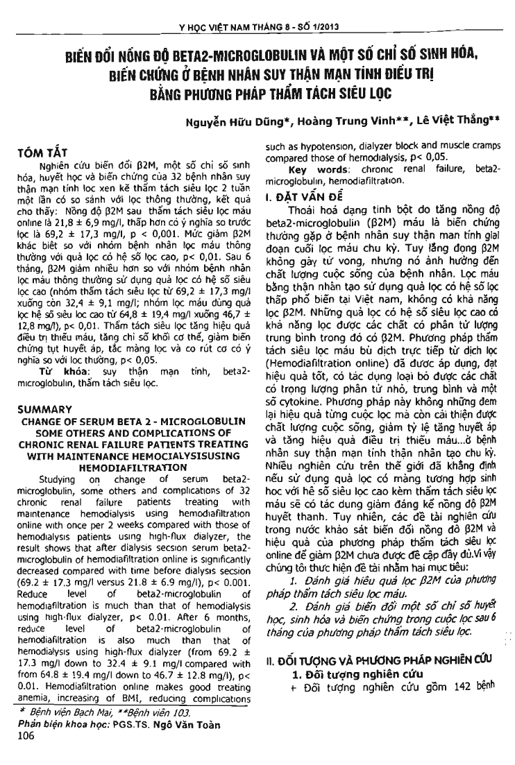 Studying on change of serum beta2microglobulin, some others and complications of 32 chronic renal failure patients treating with maintenance hemodialysis using hemodiafiltration online with once per 2 weeks compared with those of hemodialysis patients using high-flux dialyzer, the result shows that after dialysis secsion serum beta2microglobulin of hemodiafiltration online is significantly decreased compared with time before dialysis secsion (69.2 percent 17.3 mg/I versus 21.8 percent 6.9 mg/I), p 0.001. Reduce level of beta2-microglobulin of hemodiafiltration is much than that of hemodialysis using high-flux dialyzer, p 0.01. After 6 months, reduce level of beta2-microglobulin of hemodiafiltration is also much than that of hemodialysis using high-flux dialyzer (from 69.2 percent 17.3 mg/I down to 32.4 percent 9.1 mg/I compared with from 64.8 percent 19.4 mg/I down to 46.7 percent 12.8 mg/I), p 0.01. Hemodiafiltration online makes good treating anemia, increasing of BMI, reducing complications such as hypotension, dialyzer block and muscle cramps compared those of hemodialysis, p 0,05.
