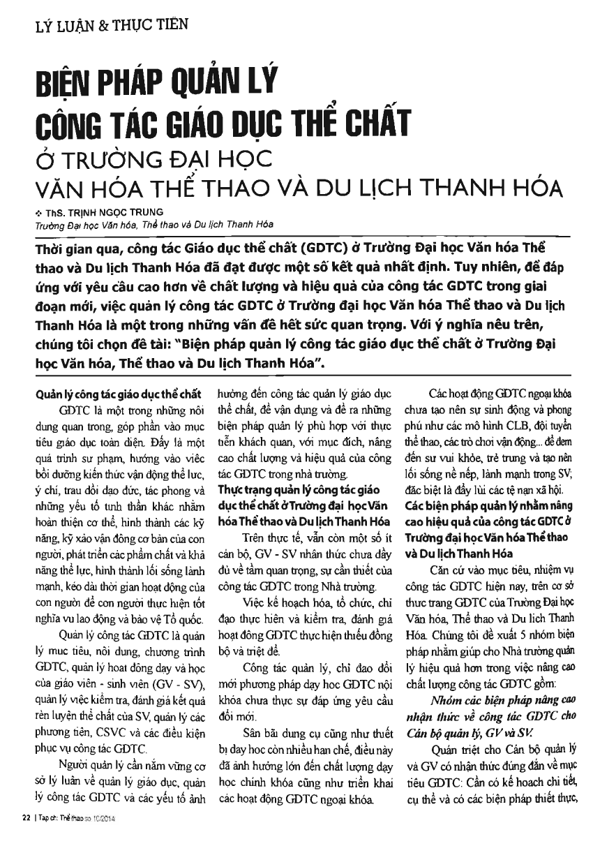 Biện pháp quản lý công tác giáo dục thể chất ở Trường đại học Văn hoá Thể thao và Du lịch Thanh Hoá