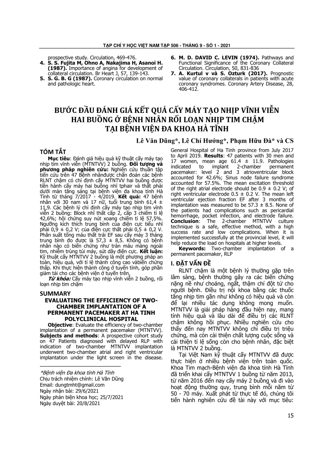 Đánh giá hiệu quả kỹ thuật cấy máy tạo nhịp tim vĩnh viễn (MTNTVV) 2 buồng. Đối tượng và phương pháp nghiên cứu: Nghiên cứu thuần tập tiến cứu trên 47 Bệnh nhânđược chẩn đoán các bệnh RLNT chậm có chỉ định cấy MTNTVV hai buồng được tiền hành cấy máy hai buồng nhĩ tphair và thất phải dưới màn tăng sáng tại bệnh viện đa khoa tỉnh Hà Tĩnh từ tháng 7/2017 - 4/2019. Kết quả: 47 bệnh nhân với 30 nam và 17 nữ, tuổi trung bình 61,4 ± 11,9. Các bệnh lý chỉ định cấy máy tạo nhịp tim vĩnh viễn 2 buồng: Block nhĩ thất cấp 2, cấp 3 chiếm tỉ lệ 42,6%; hội chứng suy nút xoang chiếm tỉ lệ 57,5%. Ngưỡng kích thích trung bình của điện cực tiểu nhĩ phải 0,9 ± 0,2 V; của điện cực thất phải 0,5 ± 0,2 V. Phân suất tống máu thất trái EF sau cấy máy 3 tháng trung bình đo được là 57,3 ± 8,5. Không có bệnh nhân nào có biến chứng như tràn máu màng ngoài tim, nhiễm trùng túi máy, sút dây điện cực. Kết luận: Kỹ thuật cấy MTNTVV 2 buồng là một phương pháp an toàn, hiệu quả, với tỉ lệ thành công cao vàbiến chứng thấp. Khi thực hiện thành công ở tuyến tỉnh, góp phần giảm tải cho các bệnh viện ở tuyến trên.