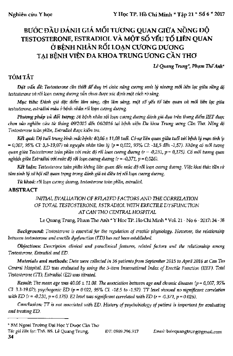 Bước đầu đánh giá mối liên quan giữa nồng độ testosterone, estradiol và một số yếu tố liên quan ở bệnh nhân rối loạn cương dương tại bệnh viện Đa khoa Trung ương Cần Thơ