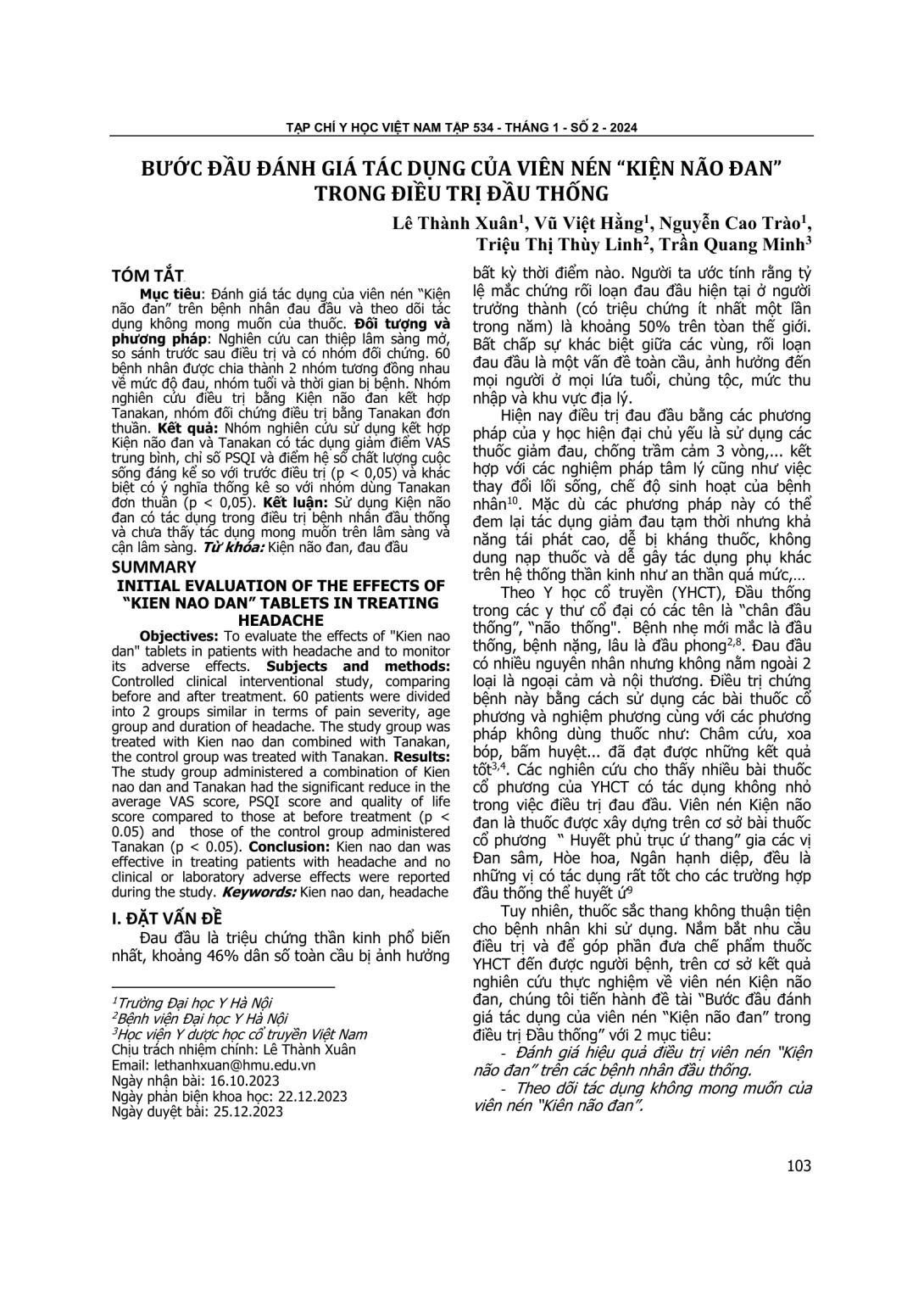 To evaluate the effects of "Kien nao dan" tablets in patients with headache and to monitor its adverse effects. Subjects and methods: Controlled clinical interventional study, comparing before and after treatment. 60 patients were divided into 2 groups similar in terms of pain severity, age group and duration of headache. The study group was treated with Kien nao dan combined with Tanakan, the control group was treated with Tanakan. Results: The study group administered a combination of Kien nao dan and Tanakan had the significant reduce in the average VAS score, PSQI score and quality of life score compared to those at before treatment (p < 0.05) and those of the control group administered Tanakan (p < 0.05). Conclusion: Kien nao dan was effective in treating patients with headache and no clinical or laboratory adverse effects were reported during the study.