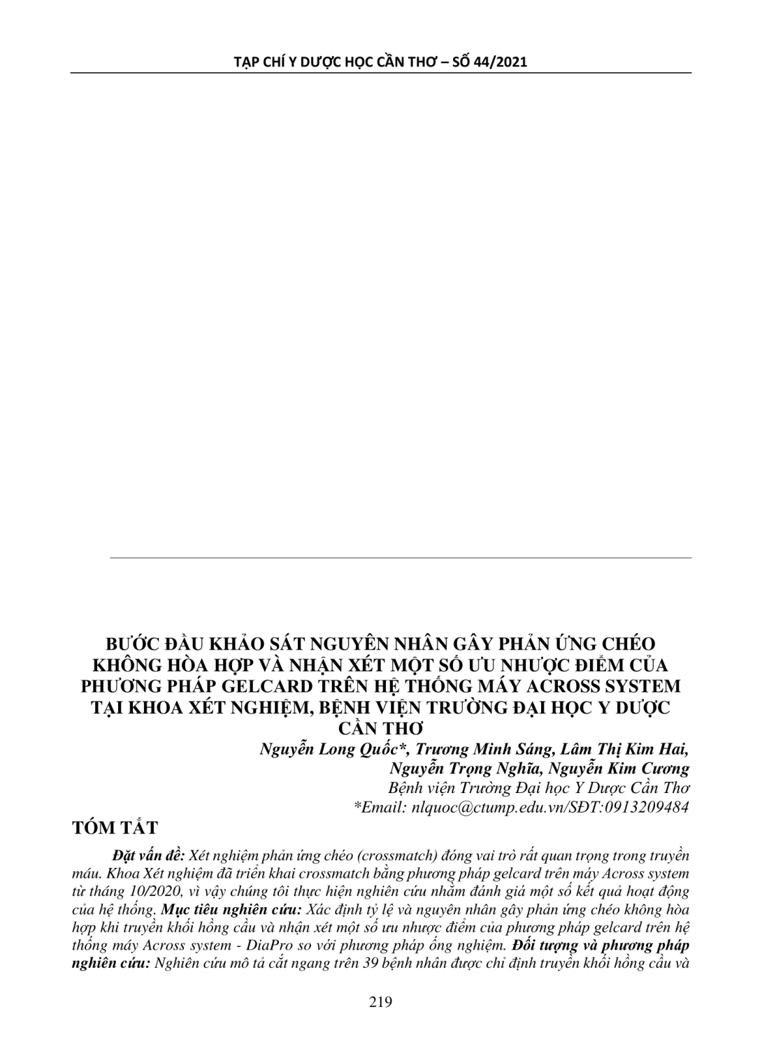 The performance of crossmatch is mandatory to ensure safety and effectiveness of blood transfusion. The Department of Laboratory has implemented gelcard technique by using the Across system since October 2020; we therefore conducted this study to review some of its advantages. Objectives: Determine the rate and causes of incompatible blood crossmatch and comment on some advantages and disadvantages of gelcard method performed on the Across system - DiaPro compared to the conventional tube method at our hospital. Materials and methods: A cross-sectional descriptive study on 39 patients who received red blood cell transfusions and were performed a 3-stage crossmatch by both gelcard and tube method. Results: 1/39 patients (2,56%) presented mismatched cross-reaction; the cause was due to the presence of abnormal red blood cells antibodies. The two methods’ results were consistent with each other in 100% of cases. The mean time to perform gelcard technique was 30,1 ± 2,1 minutes, significantly shorter than the tube technique with 60,4 ± 12,3 minutes (p < 0,05); the mean storage time for retrieval of gelcard technique was 5 ± 0,56 days, which of tube technique was just maximally 1 day (p < 0,05). Conclusions: The rate of patients with mismatched cross-reactivity accounts for 2,56% and 100% is related to the abnormal red cells antibodies; the gelcard method has shown advantages over the conventional tube method.