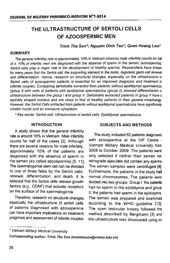 The general infertility rate is approximately 10 percent in Vietnam whereas male infertility counts for half of it. 10 percent of infertile men are diagnosed with the absence of sperm in the semen (azoospermia). Sertoli cells playa major role in the development of healthy sperms. Researchers have known for many years that the Sertoli cell, the supporting element in the testis, regulates germ cell renewal and differentiation. Hence, research on structural changes, especially on the ultrastructure of $ertoli cells of azoospermic patients is essential for an improved diagnosis and treatment of infertile couples. Comparing sertolicells extracted from patients without epididymal spermatozoa (group I) with cells of patients with epididymal spermatozoa (group II) showed differentiation in ultrastructure between the group I and group II. Sertolicells extracted patients in group II have a typically shaped nucleus and are close to that of healthy patients in their general morphology. However, the Sertoli Cells extracted from patients without epididymal spermatozoa have significantly smaller nuclei and an immature cytoplasm.