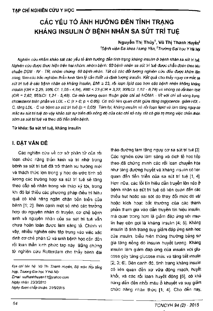 The purpose of this study was to assess insulin resistance in patients with dementia and its related factors. Subjects were classified into two groups: the dementia group with 60 patients, diagnosed according to the DSM - IV - TR criteria and the control group with 60 subjects. Subjects were examined and subjected to neurological tests and insulinemia was measured. The results show that the risk of dementia in patients with insulin resistance, BMI or = 23, and lipid disorders is higher than that in patients without insulin resistance (OR = 2.25, 95 percent CI: 1.05 to 4.84), 8MI 23 (OR 0; p 0.05). There was a significant correlation between the increased of triglycerides, decreased of HDL - C, increased of LDL - C and dementia (p 0.05). In summary, insulin resistance and lipid disorders were associated with increased risk of dementia therefore investigation on these parameters is valuable in the early diagnosis and monitoring of dementia.