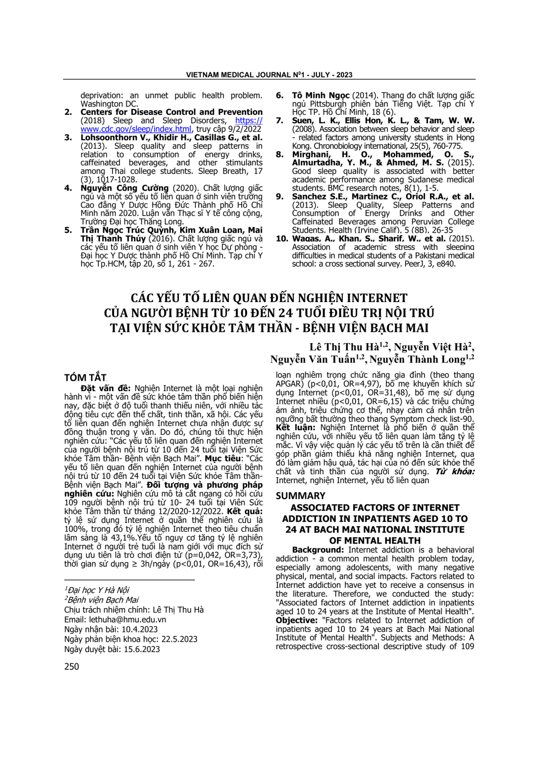 Nghiên cứu các yếu tố liên quan đến nghiện Internet của người bệnh nội trú từ 10 đến 24 tuổi tại Viện Sức khỏe Tâm thần- Bệnh viện Bạch Mai”. Đối tượng và phương pháp nghiên cứu: Nghiên cứu mô tả cắt ngang có hồi cứu 109 người bệnh nội trú từ 10- 24 tuổi tại Viên Sức khỏe Tâm thần từ tháng 12/2020-12/2022. Kết quả: tỷ lệ sử dụng Internet ở quần thể nghiên cứu là 100%, trong đó tỷ lệ nghiện Internet theo tiêu chuẩn lâm sàng là 43,1%.Yếu tố nguy cơ tăng tỷ lệ nghiên Internet ở người trẻ tuổi là nam giới với mục đích sử dụng ưu tiên là trò chơi điện tử (p=0,042, OR=3,73), thời gian sử dụng ≥ 3h/ngày (p<0,01, OR=16,43), rối loạn nghiêm trọng chức năng gia đình (theo thang APGAR) (p<0,01, OR=4,97), bố mẹ khuyến khích sử dụng Internet (p<0,01, OR=31,48), bố mẹ sử dụng Internet nhiều (p<0,01, OR=6,15) và các triệu chứng ám ảnh, triệu chứng cơ thể, nhạy cảm cá nhân trên ngưỡng bất thường theo thang Symptom check list-90. Kết luận: Nghiện Internet là phổ biến ở quần thể nghiên cứu, với nhiều yếu tố liên quan làm tăng tỷ lệ mắc. Vì vậy việc quản lý các yếu tố trên là cần thiết để góp phần giảm thiểu khả năng nghiện Internet, qua đó làm giảm hậu quả, tác hại của nó đến sức khỏe thể chất và tinh thần của người sử dụng.