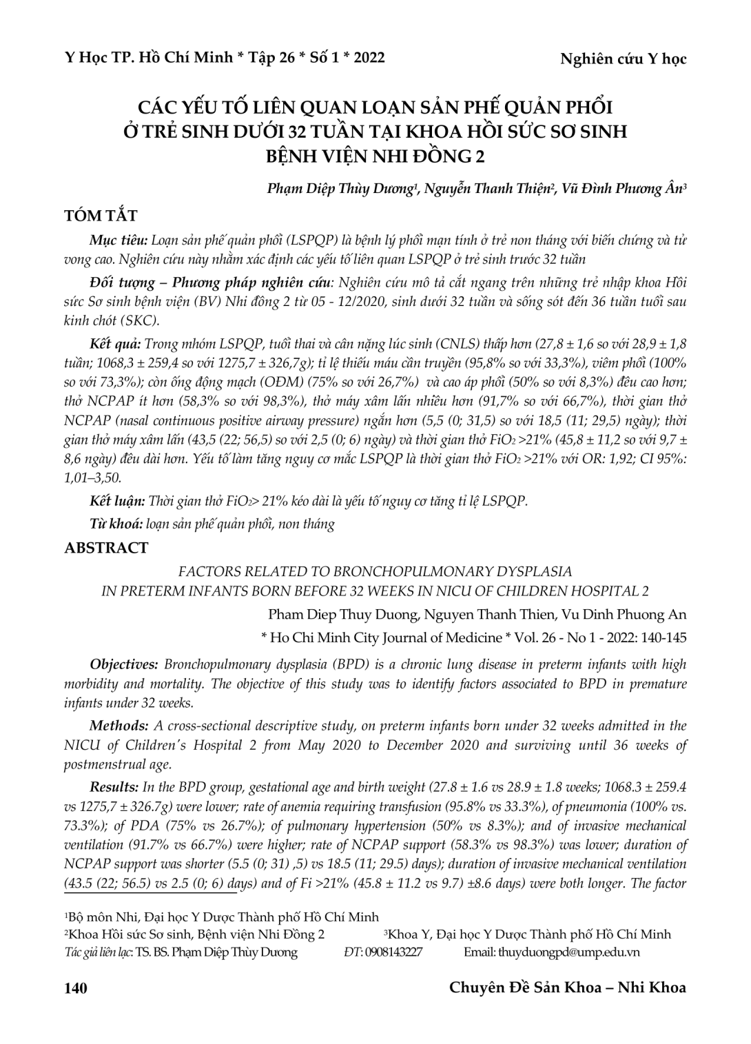 Loạn sản phế quản phổi (LSPQP) là bệnh lý phổi mạn tính ở trẻ non tháng với biến chứng và tử vong cao. Nghiên cứu này nhằm xác định các yếu tố liên quan LSPQP ở trẻ sinh trước 32 tuần Đối tượng – Phương pháp nghiên cứu: Nghiên cứu mô tả cắt ngang trên những trẻ nhập khoa Hồi sức Sơ sinh bệnh viện (BV) Nhi đồng 2 từ 05 - 12/2020, sinh dưới 32 tuần và sống sót đến 36 tuần tuổi sau kinh chót (SKC). Kết quả: Trong mhóm LSPQP, tuổi thai và cân nặng lúc sinh (CNLS) thấp hơn (27,8 ± 1,6 so với 28,9 ± 1,8 tuần; 1068,3 ± 259,4 so với 1275,7 ± 326,7g); tỉ lệ thiếu máu cần truyền (95,8% so với 33,3%), viêm phổi (100% so với 73,3%); còn ống động mạch (OĐM) (75% so với 26,7%) và cao áp phổi (50% so với 8,3%) đều cao hơn; thở NCPAP ít hơn (58,3% so với 98,3%), thở máy xâm lấn nhiều hơn (91,7% so với 66,7%), thời gian thở NCPAP (nasal continuous positive airway pressure) ngắn hơn (5,5 (0; 31,5) so với 18,5 (11; 29,5) ngày); thời gian thở máy xâm lấn (43,5 (22; 56,5) so với 2,5 (0; 6) ngày) và thời gian thở FiO2 >21% (45,8 ± 11,2 so với 9,7 ± 8,6 ngày) đều dài hơn. Yếu tố làm tăng nguy cơ mắc LSPQP là thời gian thở FiO2 >21% với OR: 1,92; CI 95%: 1,01–3,50. Kết luận: Thời gian thở FiO2> 21% kéo dài là yếu tố nguy cơ tăng tỉ lệ LSPQP.