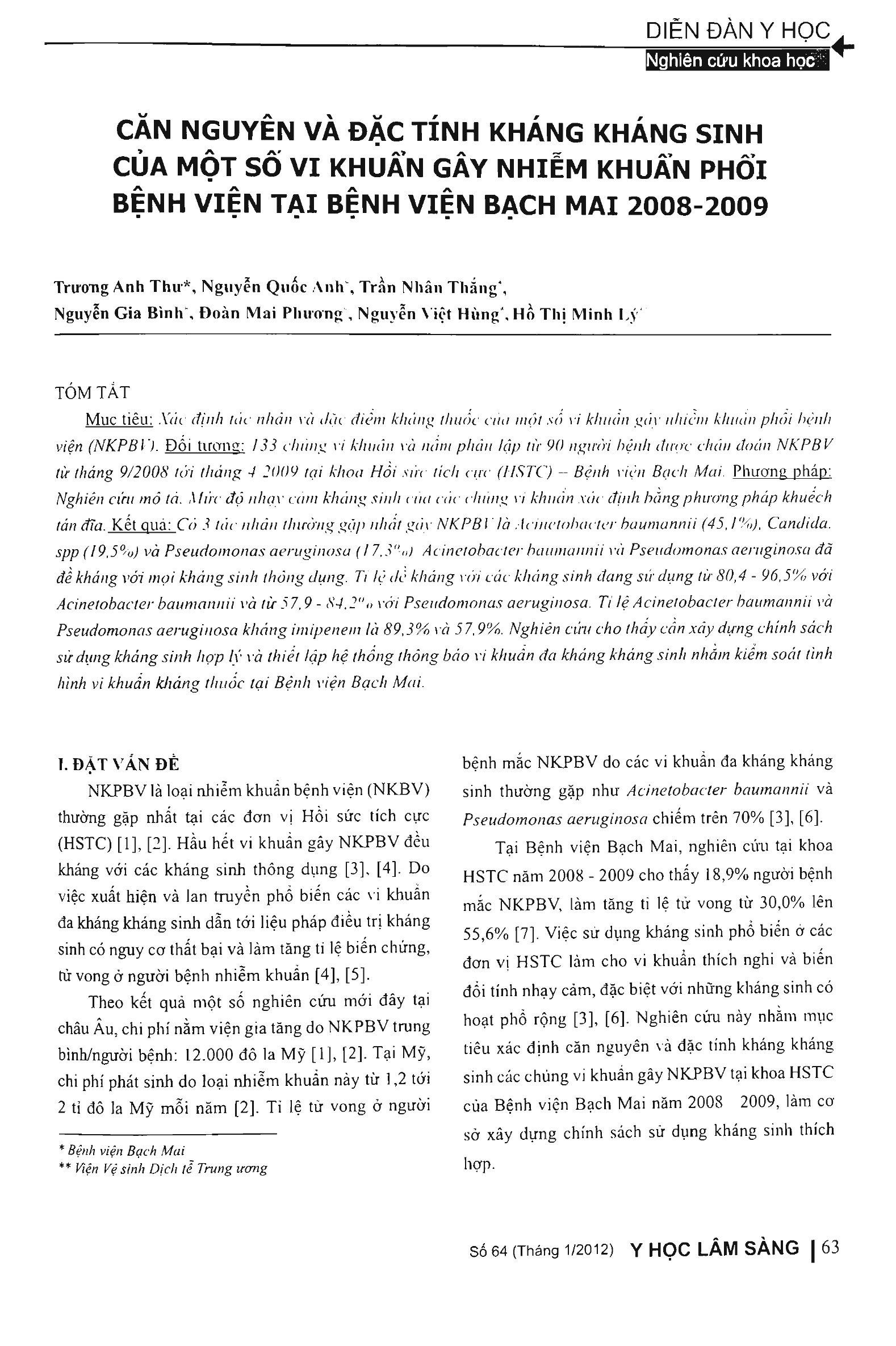 Objectives: To determine the pathogens associated with health-care associated pneumonia and describe their patterns of antimicrobial resistance. Subjects: 133 bacteria and Candida spp. Isolated from 90 patients with nosocomial pneumonia from September 2008 to April 2009 in the intensive descriptive study. Sensitivity testing was per:fonned by disk diffusion method. Results: There are 3 most common isolated microorganisms contributing to nosocomial pneumonia included Acinetobacter baumannii (45 percent). Candida spp. (19.5 percent) and Pseudomonas aeruginosa (17.3 percent). Acinetobacter baumannii and Pseudomonas aeruginosa were resistant to all commonly used antibiotics. The percentage of resistance to used antibiotics varied from 80.4 percent to 96.5 percent for Acinetobacter baumannii and from 57.9 percent to 84.2 percent for Pseudomonas aeruginosa. Pseudomonas resistant to imipenem were 89.3 percent and 57.9 percent. The study shows that it is necessary to develop policy of appropriate antibiotic use and set up reporting system of antimicrobial microol1!anisms in Bach Mai Hospital.