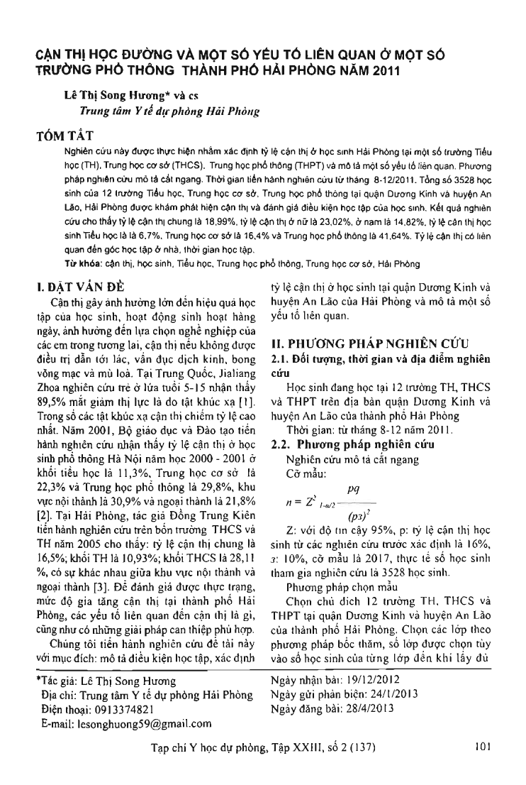 This study was carried out to identify the rate of myopia students at several primary schools, secondary schools and high schools in Hai Phong, based on some few factors. The reasearch method used is cross-sectional description. This study started in august 2011 and ran until December 2011. The total number of 3,528 students from 12 primary schools, secondary schools, high schools in Duong Kinh District and An Lao Commune, Hai Phong were examined to detect the rate of myopia and condition assessment of student learning. The result of the study showed that the general rate of myopia was 18.99 percent, the percentage of female and men myopia were 23.02 percent and 14.82 percent, respectively, the rate of myopia students at primary schools, secondary schools, high schools were 6.7 percent,16.4 percent and 41.64 percent respectively. The rate of myopia students was subject to their study comers at home, learning time when studying.