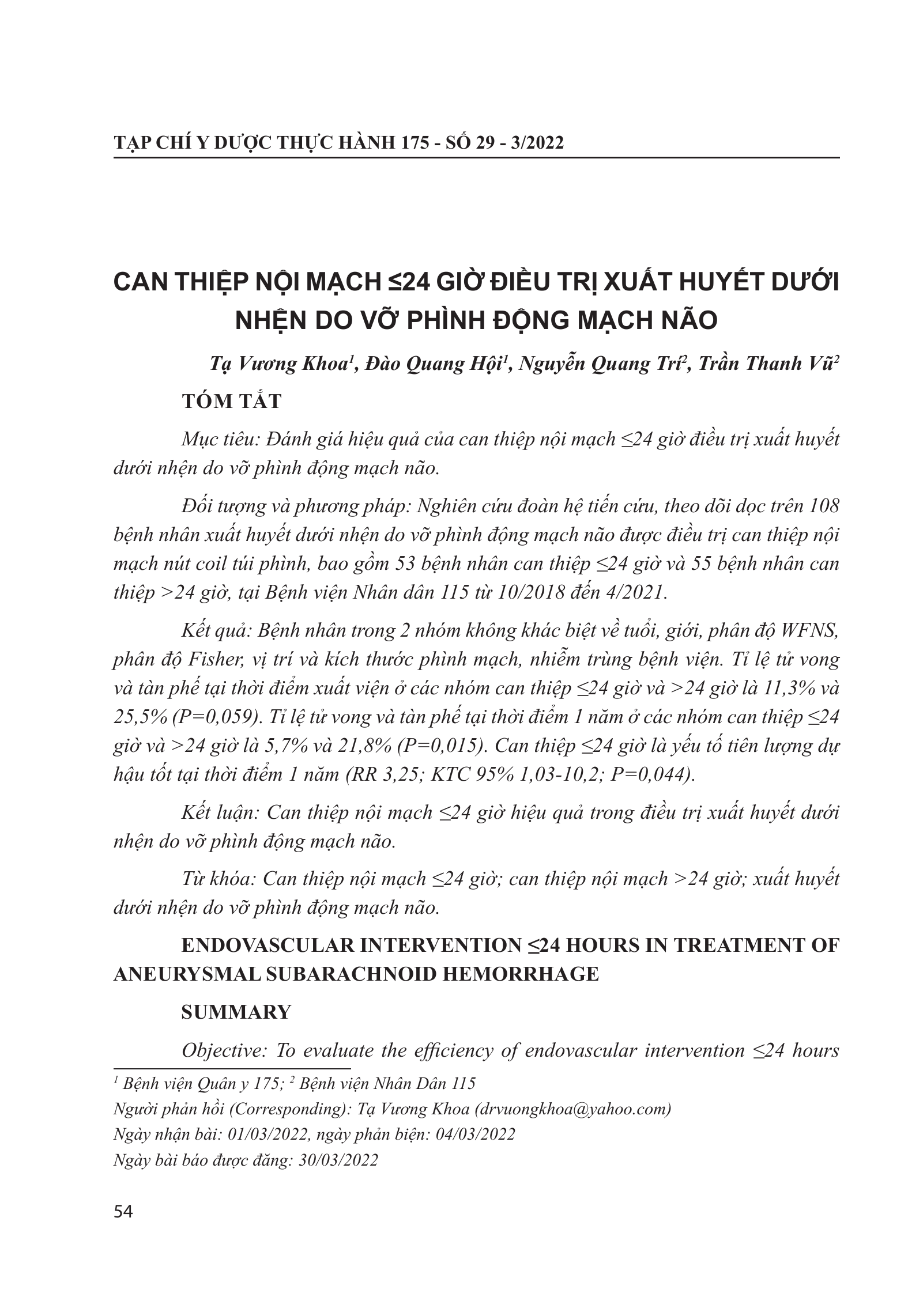 Đánh giá hiệu quả của can thiệp nội mạch ≤24 giờ điều trị xuất huyết dưới nhện do vỡ phình động mạch não. Đối tượng và phương pháp: Nghiên cứu đoàn hệ tiến cứu, theo dõi dọc trên 108 bệnh nhân xuất huyết dưới nhện do vỡ phình động mạch não được điều trị can thiệp nội mạch nút coil túi phình, bao gồm 53 bệnh nhân can thiệp ≤24 giờ và 55 bệnh nhân can thiệp >24 giờ, tại Bệnh viện Nhân dân 115 từ 10/2018 đến 4/2021. Kết quả: Bệnh nhân trong 2 nhóm không khác biệt về tuổi, giới, phân độ WFNS, phân độ Fisher, vị trí và kích thước phình mạch, nhiễm trùng bệnh viện. Tỉ lệ tử vong và tàn phế tại thời điểm xuất viện ở các nhóm can thiệp ≤24 giờ và >24 giờ là 11,3% và 25,5% (P=0,059). Tỉ lệ tử vong và tàn phế tại thời điểm 1 năm ở các nhóm can thiệp ≤24 giờ và >24 giờ là 5,7% và 21,8% (P=0,015). Can thiệp ≤24 giờ là yếu tố tiên lượng dự hậu tốt tại thời điểm 1 năm (RR 3,25; KTC 95% 1,03-10,2; P=0,044). Kết luận: Can thiệp nội mạch ≤24 giờ hiệu quả trong điều trị xuất huyết dưới nhện do vỡ phình động mạch não.