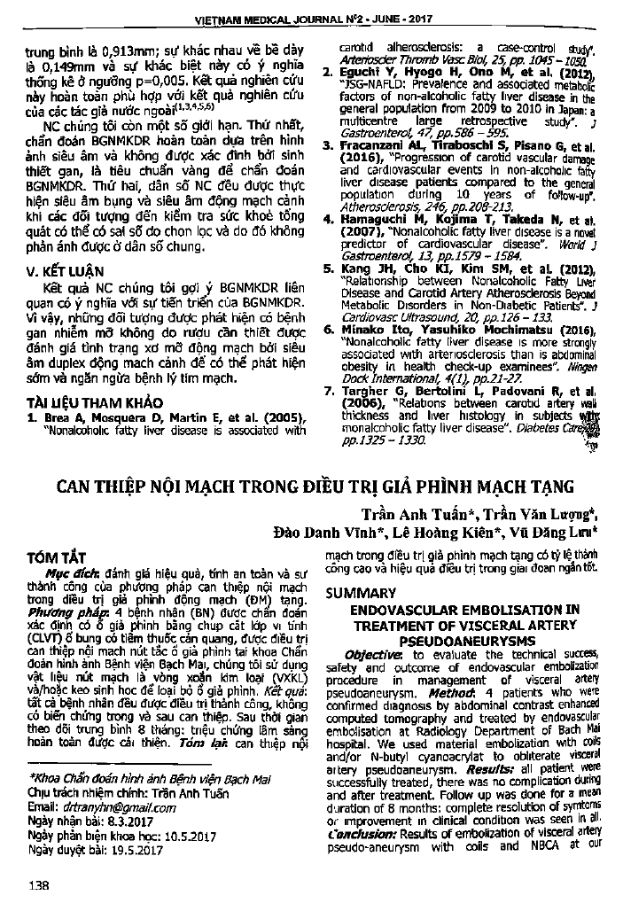 Can thiệp nội mạch trong điều trị giả phình mạch tạng trên 4 bệnh nhân được chẩn đoán xác định có ổ gỉa phình bằng chụp cắt lớp vi tính ổ bụng có tiêm thuốc cản quang, điều trị tại bệnh viện Bạch Mai. Kết quả nghiên cứu cho thấy can thiệp nội mạch trong điều trị giả phình động mạch tạng có tỷ lệ thành công cao và hiệu quả điều trị trong giai đoạn ngắn tốt.