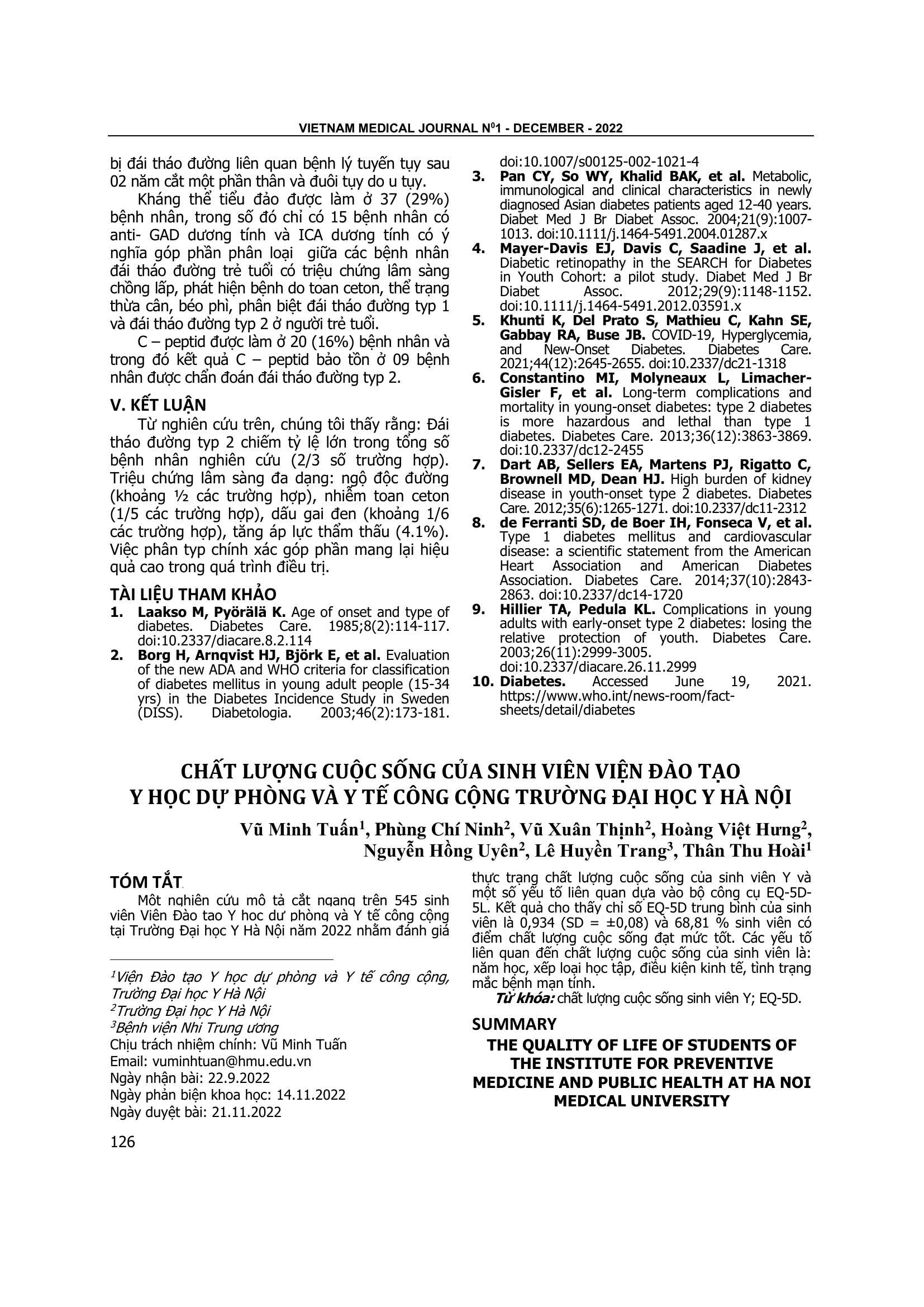 Nghiên cứu mô tả cắt ngang trên 545 sinh viên Viện Đào tạo Y học dự phòng và Y tế công cộng tại Trường Đại học Y Hà Nội năm 2022 nhằm đánh giá thực trạng chất lượng cuộc sống của sinh viên Y và một số yếu tố liên quan dựa vào bộ công cụ EQ-5D-5L. Kết quả cho thấy chỉ số EQ-5D trung bình của sinh viên là 0,934 (SD = ±0,08) và 68,81 % sinh viên có điểm chất lượng cuộc sống đạt mức tốt. Các yếu tố liên quan đến chất lượng cuộc sống của sinh viên là: năm học, xếp loại học tập, điều kiện kinh tế, tình trạng mắc bệnh mạn tính.