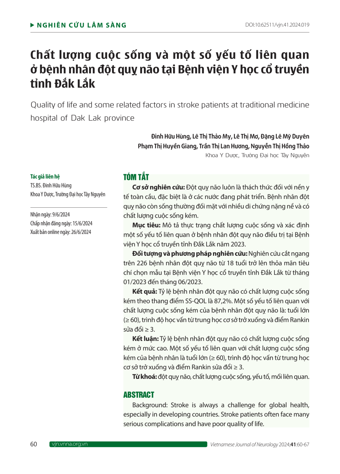 Stroke is always a challenge for global health, especially in developing countries. Stroke patients often face many serious complications and have poor quality of life. Objectives: We aimed to describe the current status of quality of life and identify some related factors in stroke patients treated at traditional medicine hospital of Dak Lak Province in 2023. Subjects and methods: cross-sectional study on 226 stroke patients aged 18 years and older who met sampling criteria at traditional medicine hospital of Dak Lak Province from January 2023 to June 2023.Results: The proportion of stroke patients with poor quality of life according to the SS-QOL scale was 87.2%. Some factors associated with poor quality of life of stroke patients are: older age (≥ 60), education level from junior high school or less and modified Rankin score ≥ 3. Conclusions: the proportion of stroke patients with poor quality of life is high. Some factors associated with poor quality of life of patients are older age (≥ 60), education level from junior high school or less and modified Rankin score ≥ 3.
