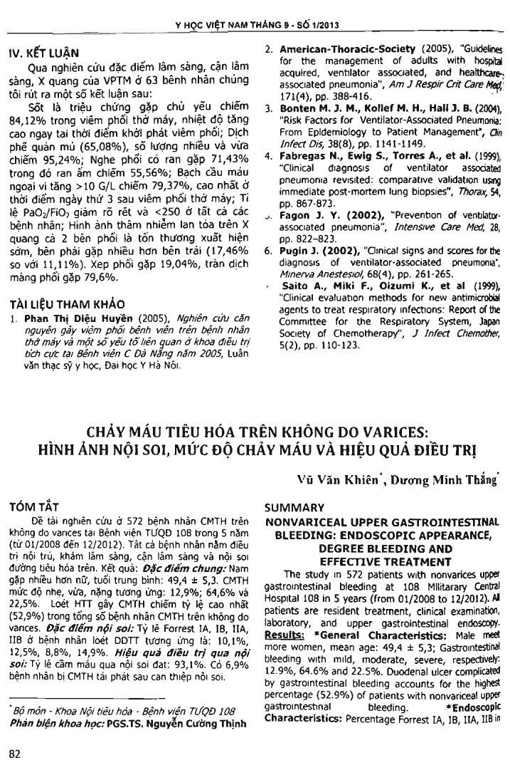 The study in 572 patientS with nonvarices upper gastrointestinal bleeding treated at the Militarary Central Hospital No.108 in 5 years (from 01/2008 to 12/2012). All patients are resident treatment, clinical examination, laboratory, and upper gastrointestinal endoscopy. Results: General Characteristics: Male meet more women, mean age: 49,4 + or - 5,3; Gastrointestinal bleeding with mild, moderate, severe, respectively: 12.9 percent, 64.6 percent and 22.5 percent. Duodenal ulcer complicated by gastrointestinal bleeding accounts for the highest percentage (52.9 percent) of patients with nonvariceal upper gastrointestinal bleeding. Endoscopic Characteristics: Percentage Forrest lA, 16, lIA, lIB in patients with Gastro-duoenal ulcer, respectively: 10.1 percent, 12.5 percent, 8.8 percent, 14.9 percent. Effective endoscopic therapy: Percentage of endoscopic hemostasis achieved: 93.1 percent. 6.9 percent of patients with rebleeding after endoscopic therapy.
