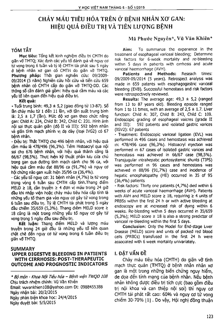 Aim: To summarize the experience in the treatment of esophageal variceal bleeding; Determine risk factors for 6-week mortality and re-bleeding within 5 days in patients with cirrhosis and acute variceal haemorrhage (AVH). Patients and Methods: Reseach times: 09/2009-09/2014. Retrospect analysis was made in 659 patents with esophagogastric variceal bleeding (EVB). Successful hemostasis and risk factors were retrospectively reviewed. Results: The average age: 49,3 : 5,2 (ranged from 13 to 87 years old). Bleeding episode ranged from 1 to 11 times, with an average of 2,5: 1.7. Uver function: Child A: 307, Child B: 243, Child C: 109. Endoscopic grading of esophageal vaicres (grade II and III): 592 patients and isolated gastric varices (IGV2): 67 patients. Treatment: Endoscopic variceal ligation (EVL) was performed in 496 cases and hemostasis was achieved in: 478/496 case (96,3 percent). Histoacryl injection was performed in 67 cases of isolated gastric varices and hemostasis was achieved in 66/67 case (98,5 percent). Transjugular intrahepatic portosystemic shunts (TIPS) was performed in 96 cases and hemostasis was achieved in 88/96 (91,7 percent) case and inddence of hepatic encephalopathy (HE) occurred in 35 of 95 (36,4 percent) patients. Risk factors: Thirty one patients (4,7 percent) died within 6 weeks of acute variceal haemorrhage (AVH). Patients with AVH and MELD score or = 18, requiring or = 4 units of PRBSs within the first 24 h or with active bleeding at endoscopy are at increased risk of dying within 6 weeks. Re-bleeding within 5 days occurred in 35/659 (5,3 percent); MELD score or = 18 is also a strong predictor of variceal re-bleeding within the first 5 days. Conclusion: Only the Model for End-stage Uver Disease (MELD) score and ullits of packed red blood cells (PRBCs) transfused in the first 24 h were associated with 6 week mortality univariately.