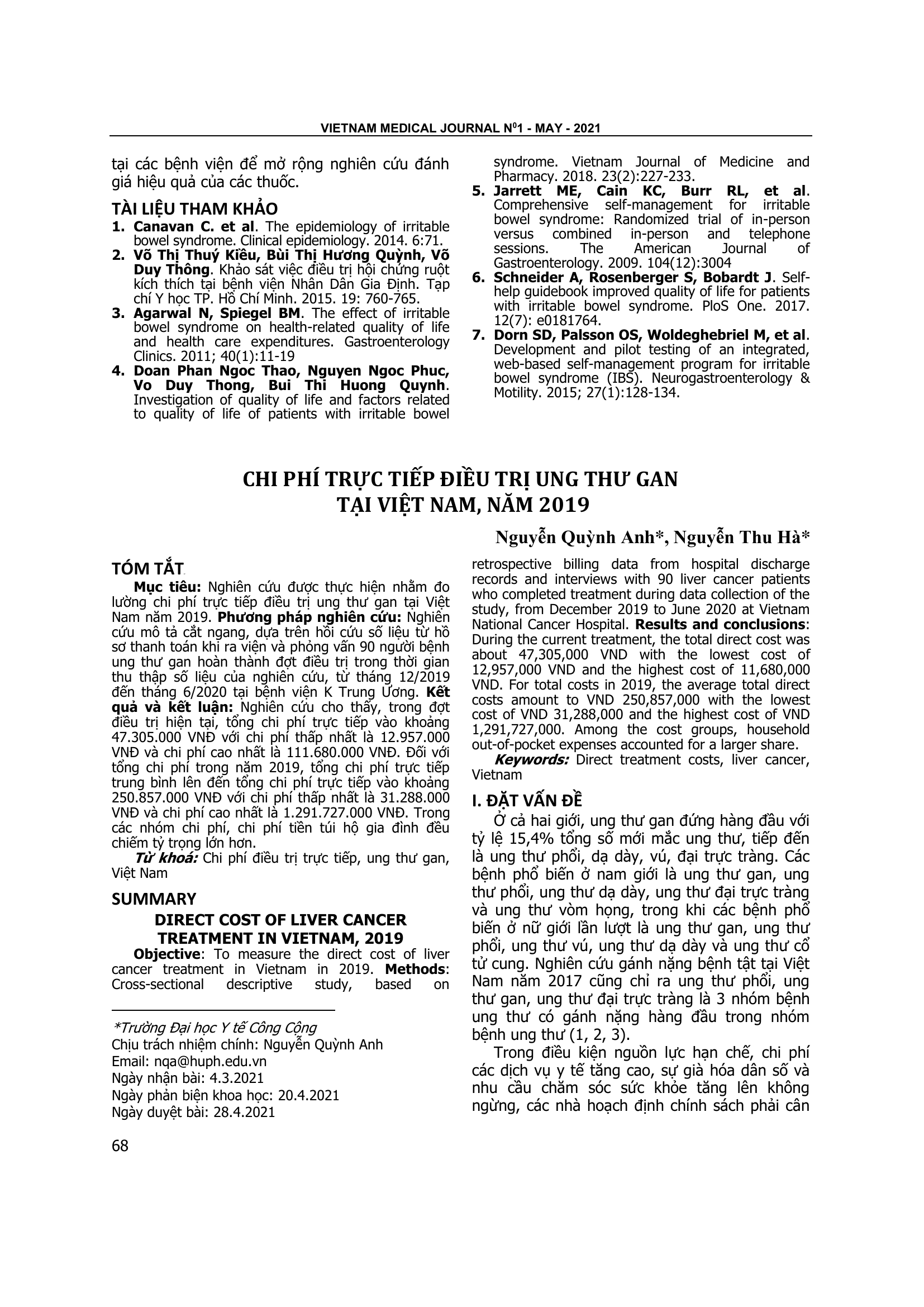 Nghiên cứu được thực hiện nhằm đo lường chi phí trực tiếp điều trị ung thư gan tại Việt Nam năm 2019. Phương pháp nghiên cứu: Nghiên cứu mô tả cắt ngang, dựa trên hồi cứu số liệu từ hồ sơ thanh toán khi ra viện và phỏng vấn 90 người bệnh ung thư gan hoàn thành đợt điều trị trong thời gian thu thập số liệu của nghiên cứu, từ tháng 12/2019 đến tháng 6/2020 tại bệnh viện K Trung Ương. Kết quả và kết luận: Nghiên cứu cho thấy, trong đợt điều trị hiện tại, tổng chi phí trực tiếp vào khoảng 47.305.000 VNĐ với chi phí thấp nhất là 12.957.000 VNĐ và chi phí cao nhất là 111.680.000 VNĐ. Đối với tổng chi phí trong năm 2019, tổng chi phí trực tiếp trung bình lên đến tổng chi phí trực tiếp vào khoảng 250.857.000 VNĐ với chi phí thấp nhất là 31.288.000 VNĐ và chi phí cao nhất là 1.291.727.000 VNĐ. Trong các nhóm chi phí, chi phí tiền túi hộ gia đình đều chiếm tỷ trọng lớn hơn.