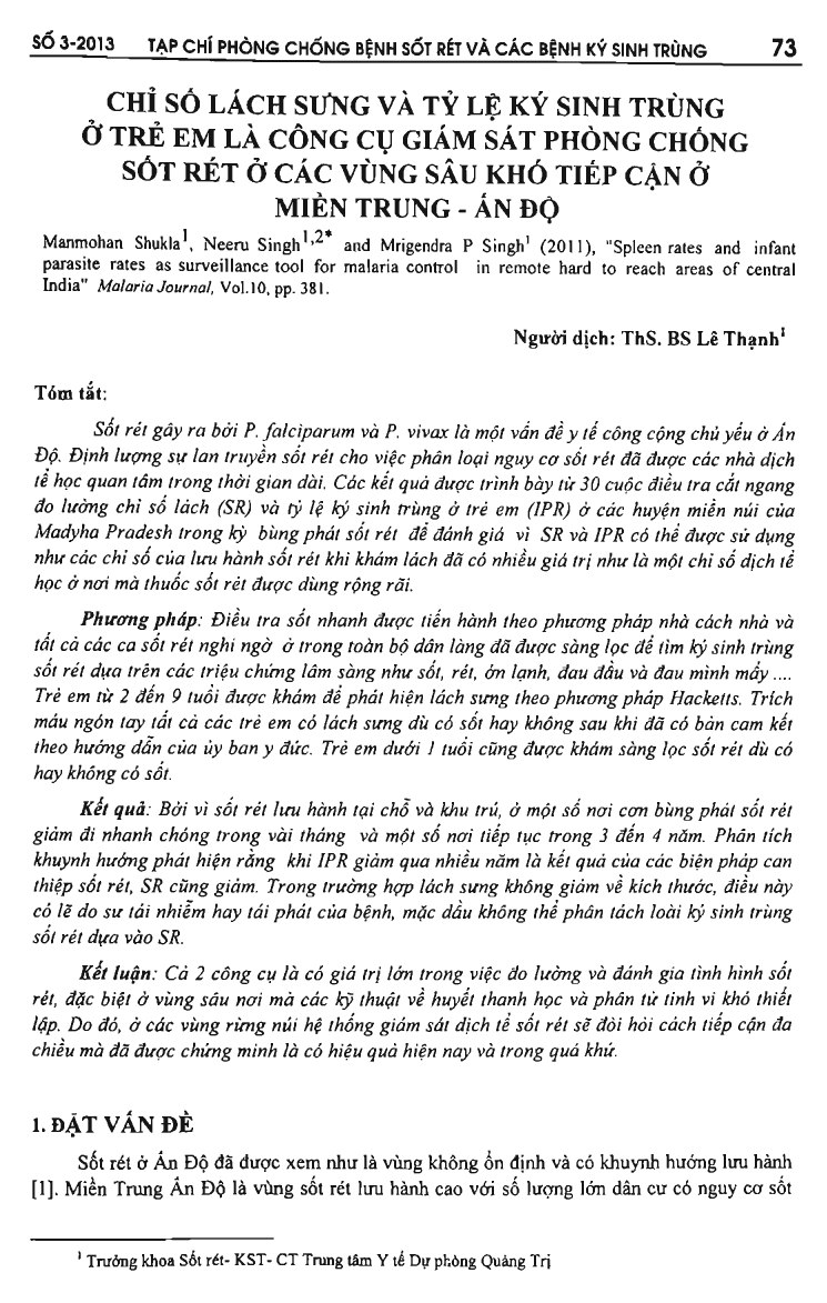 Chỉ số lách sưng và tỷ lệ ký sinh trùng ở trẻ em là công cụ giám sát phòng chống sốt rét ở các vùng sâu khó tiếp cạn ở miền Trung - ấn Độ