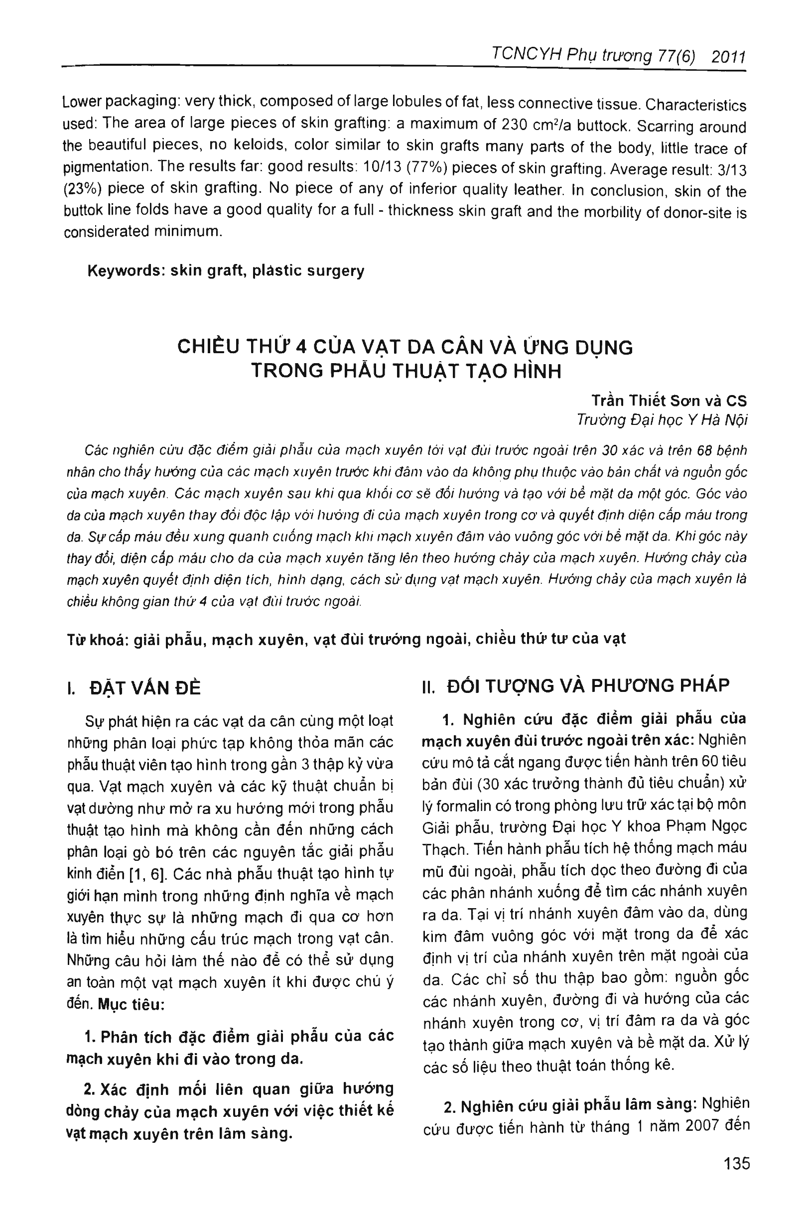 The anterolateral thigh flap was widely used in plastic surgery as a perforator flap based on the vessels from the descending branch of the lateral femoral circumflex artery. However, the broad range of anatomic variation of the perforators is a mainly disavantage of this flap. Perforator anatomy and their direction to the anterolateral thigh flap were examined in 60 specimens of 30 Vietnamese cadavers and in 74 anterolateral thigh flaps of 68 patients. The direction of perforator in muscle and the angle between perforator and deep fascial layer at percing point was analyzed. The findings in this study suggest that the design of the anterolateral thigh flap should be based on the angle of perforator into the deep fascia. Forth dimention of the flap was considerably based on flow direction of perforator.