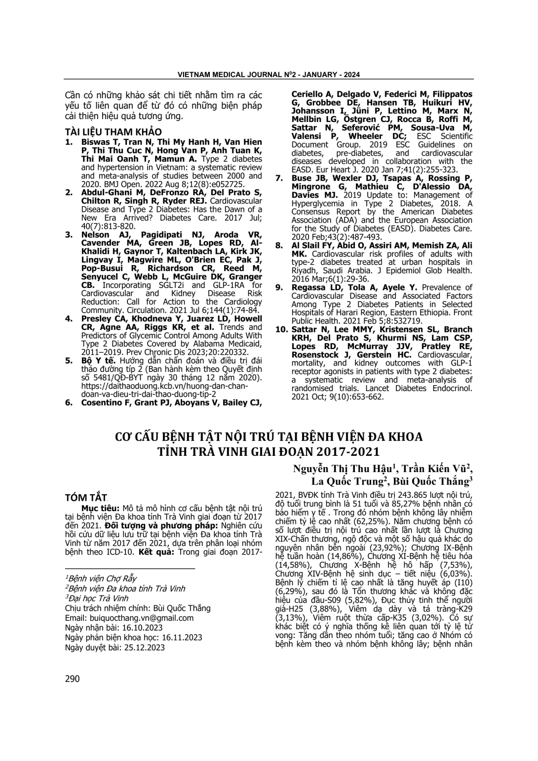 Mô tả mô hình cơ cấu bệnh tật nội trú tại bệnh viện Đa khoa tỉnh Trà Vinh giai đoạn từ 2017 đến 2021. Đối tượng và phương pháp: Nghiên cứu hồi cứu dữ liệu lưu trữ tại bệnh viện Đa khoa tỉnh Trà Vinh từ năm 2017 đến 2021, dựa trên phân loại nhóm bệnh theo ICD-10. Kết quả: Trong giai đoạn 2017-2021, BVĐK tỉnh Trà Vinh điều trị 243.865 lượt nội trú, độ tuổi trung bình là 51 tuổi và 85,27% bệnh nhân có bảo hiểm y tế . Trong đó nhóm bệnh không lây nhiễm chiếm tỷ lệ cao nhất (62,25%). Năm chương bệnh có số lượt điều trị nội trú cao nhất lần lượt là Chương XIX-Chấn thương, ngộ độc và một số hậu quả khác do nguyên nhân bên ngoài (23,92%); Chương IX-Bệnh hệ tuần hoàn (14,86%), Chương XI-Bệnh hệ tiêu hóa (14,58%), Chương X-Bệnh hệ hô hấp (7,53%), Chương XIV-Bệnh hệ sinh dục – tiết niệu (6,03%). Bệnh lý chiếm tỉ lệ cao nhất là tăng huyết áp (I10) (6,29%), sau đó là Tổn thương khác và không đặc hiệu của đầu-S09 (5,82%), Đục thủy tinh thể người già-H25 (3,88%), Viêm dạ dày và tá tràng-K29 (3,13%), Viêm ruột thừa cấp-K35 (3,02%). Có sự khác biệt có ý nghĩa thống kê liên quan tới tỷ lệ tử vong: Tăng dần theo nhóm tuổi; tăng cao ở Nhóm có bệnh kèm theo và nhóm bệnh không lây; bệnh nhân có thời gian nhập viện điều trị giai đoạn tháng 10 đến tháng 12 có tỉ lệ tử vong cao hơn so với các khoảng thời gian khác. Kết luận: Bệnh nhân nội trú điều trị tại Bệnh viện Đa khoa tỉnh Trà Vinh phần lớn là nhóm người cao tuổi có sử dụng Bảo hiểm y tế. Bệnh điều trị chủ yếu là nhóm bệnh không lây với bệnh lý tăng huyết áp chiếm tỷ lệ cao. Chương bệnh về chấn thương ngộ độc chiếm tỷ lệ cao nhất tiếp đó là chương bệnh về tuần hoàn, tiêu hóa và hô hấp.