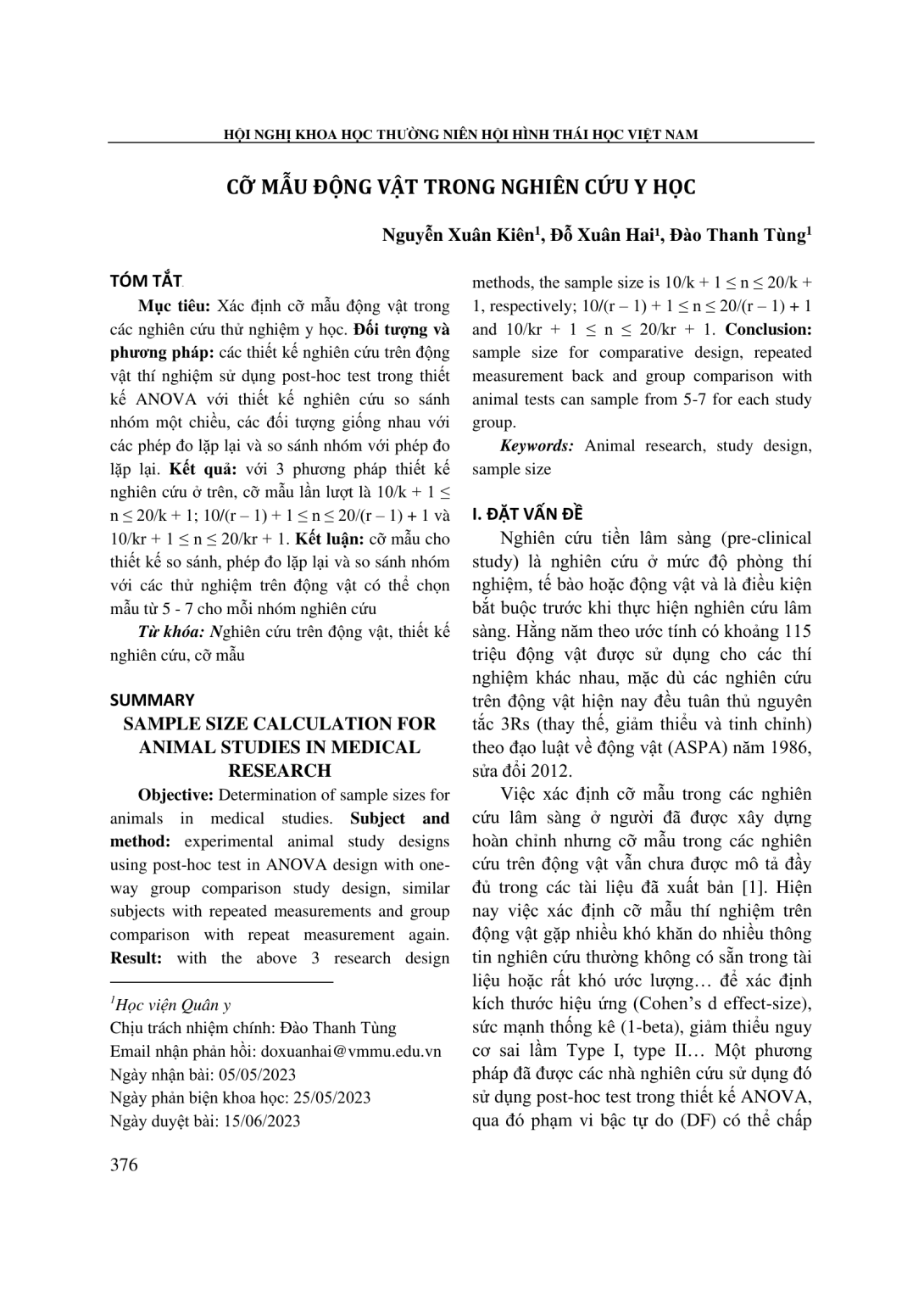 Xác định cỡ mẫu động vật trong các nghiên cứu thử nghiệm y học. Đối tượng và phương pháp: các thiết kế nghiên cứu trên động vật thí nghiệm sử dụng post-hoc test trong thiết kế ANOVA với thiết kế nghiên cứu so sánh nhóm một chiều, các đối tượng giống nhau với các phép đo lặp lại và so sánh nhóm với phép đo lặp lại. Kết quả: với 3 phương pháp thiết kế nghiên cứu ở trên, cỡ mẫu lần lượt là 10/k + 1 ≤ n ≤ 20/k + 1; 10/(r – 1) + 1 ≤ n ≤ 20/(r – 1) + 1 và 10/kr + 1 ≤ n ≤ 20/kr + 1. Kết luận: cỡ mẫu cho thiết kế so sánh, phép đo lặp lại và so sánh nhóm với các thử nghiệm trên động vật có thể chọn mẫu từ 5 - 7 cho mỗi nhóm nghiên cứu.