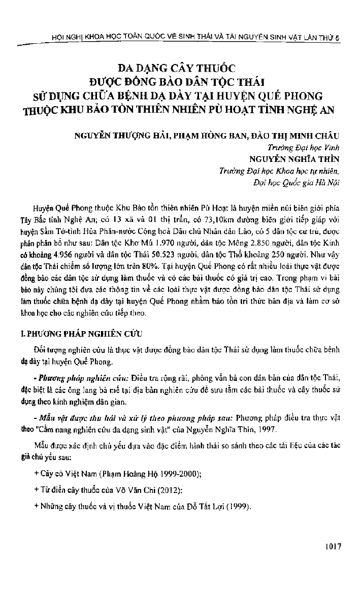 Đa dạng cây thuốc được đồng bào dân tộc Thái sử dụng chữa bệnh dạ dày tại huyện Quế Phong thuộc khu bảo tồn thiên nhiên Pù Hoạt tỉnh Nghệ An