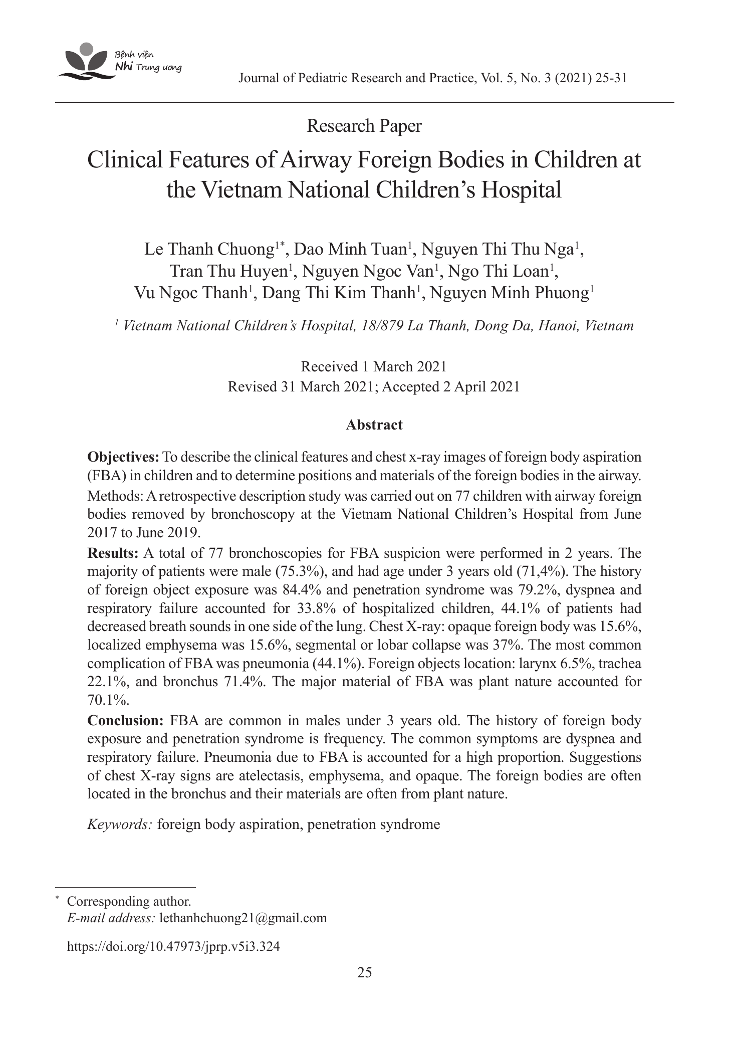 Mô tả đặc điểm lâm sàng và X-quang ngực của trẻ bị dị vật đường thở và nhận xét vị trí trong đường thở và bản chất của dị vật. Phương pháp: Nghiên cứu mô tả hồi cứu được tiến hành trên 77 trẻ điều trị tại Bệnh viện Nhi Trung ương được nội soi phế quản có dị vật đường thở từ tháng 6/2017 – 6/2019. Kết quả: 77 trẻ bị dị vật đường thở trong 2 năm, trẻ nam chiếm 75,3%, trẻ dưới 3 tuổi chiếm 71,4%. Tiền sử tiếp xúc dị vật và hội chứng xâm nhập gặp ở đa số trẻ (84,4% và 79,2%), khó thở và suy hô hấp chiếm 33,8% trẻ nhập viện, 44,1 % có giảm thông một bên phổi. X-quang phổi: cản quang 15,6%, ứ khí 15,6%, xẹp phổi 37,7%. Biến chứng viêm phổi thường gặp nhất (44,1%). Vị trí dị vật: thanh quản 6,5%, khí quản 22,1%, phế quản 71,4%. Di vật có bản chất thực vật chiếm đa số (70,1%). Kết luận:Dị vật đường thở hay gặp ở trẻ nam, dưới 3 tuổi, đa số khai thác được tiền sử tiếp xúc dị vật và hội chứng xâm nhập, triệu chứng hay gặp khi nhập viện là khó thở và suy hô hấp, biến chứng viêm phổi chiếm tỷ lệ cao. Dấu hiệu X-quang gợi ý là xẹp phổi, ứ khí và cản quang. Dị vật thường nằm ở phế quản và có bản chất thực vật.