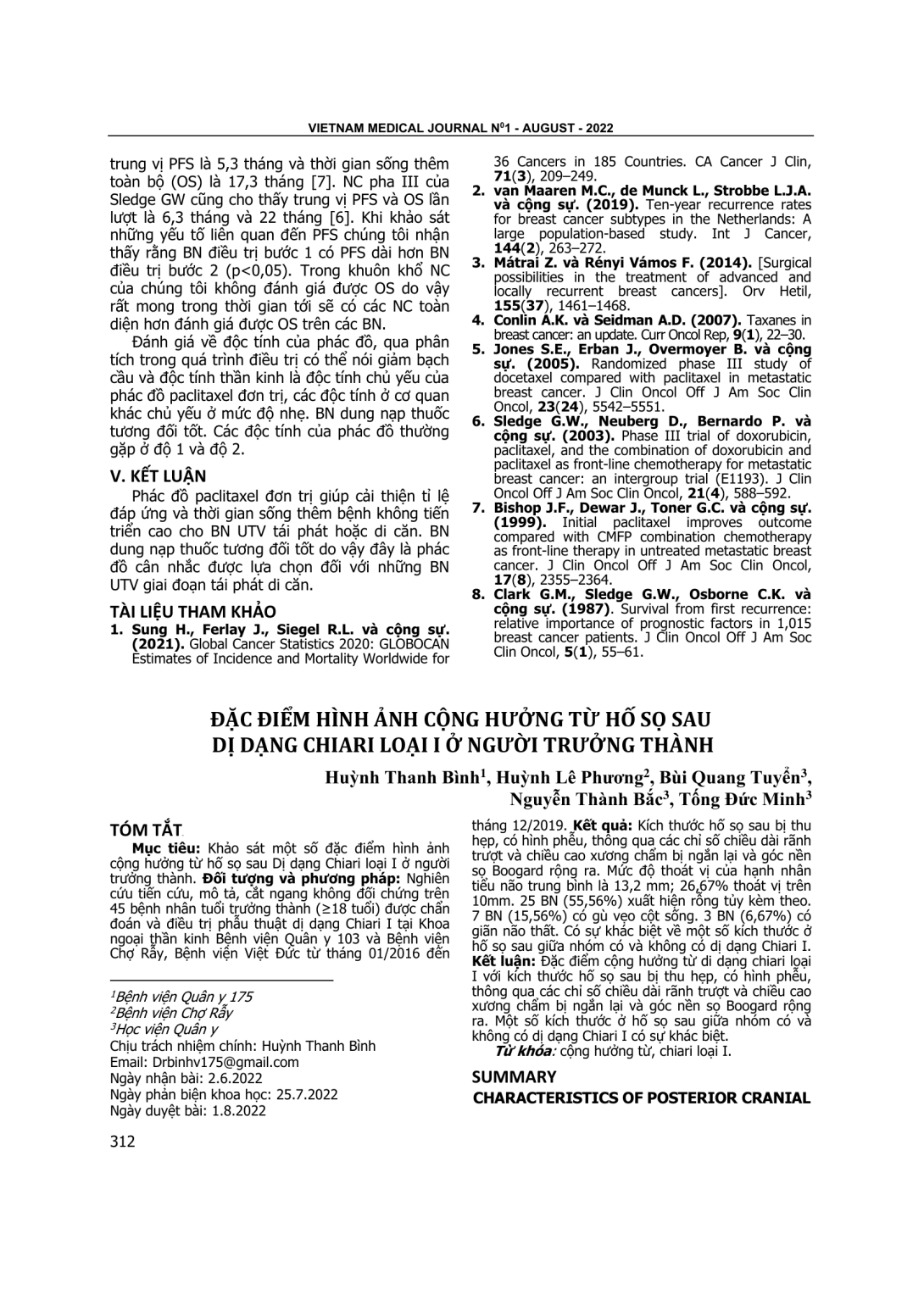 Khảo sát một số đặc điểm hình ảnh cộng hưởng từ hố sọ sau Dị dạng Chiari loại I ở người trưởng thành. Đối tượng và phương pháp: Nghiên cứu tiến cứu, mô tả, cắt ngang không đối chứng trên 45 bệnh nhân tuổi trưởng thành (≥18 tuổi) được chẩn đoán và điều trị phẫu thuật dị dạng Chiari I tại Khoa ngoại thần kinh Bệnh viện Quân y 103 và Bệnh viện Chợ Rẫy, Bệnh viện Việt Đức từ tháng 01/2016 đến tháng 12/2019. Kết quả: Kích thước hố sọ sau bị thu hẹp, có hình phễu, thông qua các chỉ số chiều dài rãnh trượt và chiều cao xương chẩm bị ngắn lại và góc nền sọ Boogard rộng ra. Mức độ thoát vị của hạnh nhân tiểu não trung bình là 13,2 mm; 26,67% thoát vị trên 10mm. 25 BN (55,56%) xuất hiện rỗng tủy kèm theo. 7 BN (15,56%) có gù vẹo cột sống. 3 BN (6,67%) có giãn não thất. Có sự khác biệt về một số kích thước ở hố sọ sau giữa nhóm có và không có dị dạng Chiari I. Kết luận: Đặc điểm cộng hưởng từ di dạng chiari loại I với kích thước hố sọ sau bị thu hẹp, có hình phễu, thông qua các chỉ số chiều dài rãnh trượt và chiều cao xương chẩm bị ngắn lại và góc nền sọ Boogard rộng ra. Một số kích thước ở hố sọ sau giữa nhóm có và không có dị dạng Chiari I có sự khác biệt.