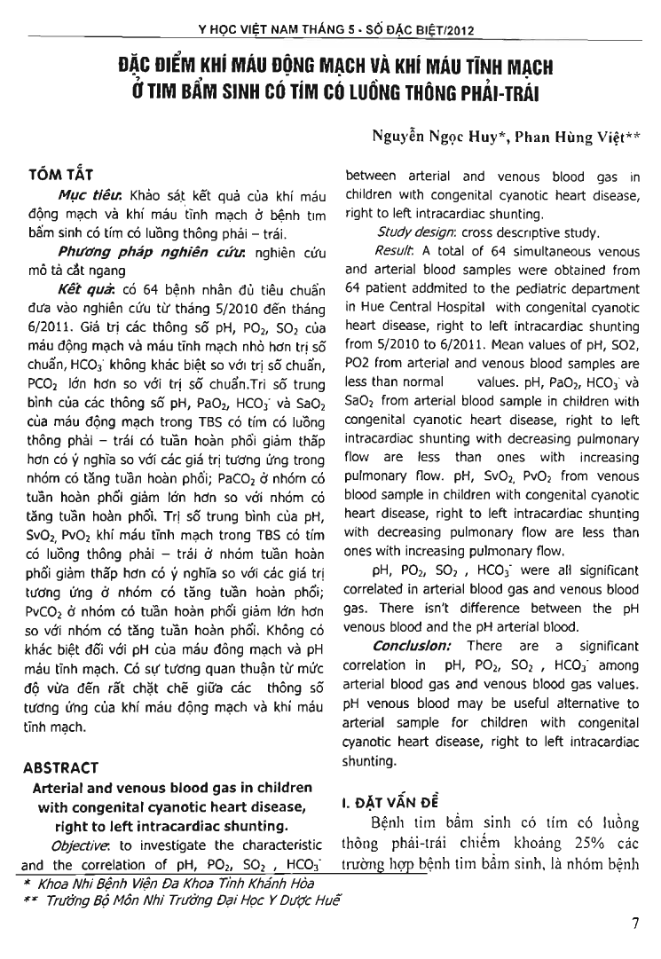 Objective: to investigate the characteristic and the correlation of pH, PO2, SO2 , HCO3 between arterial and venous blood gas in children with congenital cyanotic heart disease, right to left intracardiac shunting. Study design: cross descriptive study. Result A total of 64 simultaneous venous and arterial blood samples were obtained from 64 patient addmited to the pediatric department in Hue Central Hospital with congenital cyanotic heart disease, right to left intracardiac shunting from 5/2010 to 6/2011. Mean values of pH, SO2, PO2 from arterial and venous blood samples are less than normal values. pH, PaO2, HCO3- and SaO2 from arterial blood sample in children with congenital cyanotic heart disease, right to left intracardiac shunting with decreasing pulmonary flow are less than ones with increasing pulmonary flow. pH, SvO2, PvO2 from venous blood sample in children with .congenital cyanotic heart disease, right to left Intracardiac shunting with decreasing pulmonary flow are less than ones with increasing pulmonary flow. pH, PO2, SO2 , HCO3- were all significant correlated in arterial blood gas and venous blood gas. There isn't difference between the pH venous blood and the pH arterial blood. Conclusion: There are a significant correlation in pH, PO2, SO2 , HCO3- among arterial blood gas and venous blood gas values. pH venous blood may be useful alternative to arterial sample for children with congenital cyanotic heart disease, right to left intracardiac shunting.