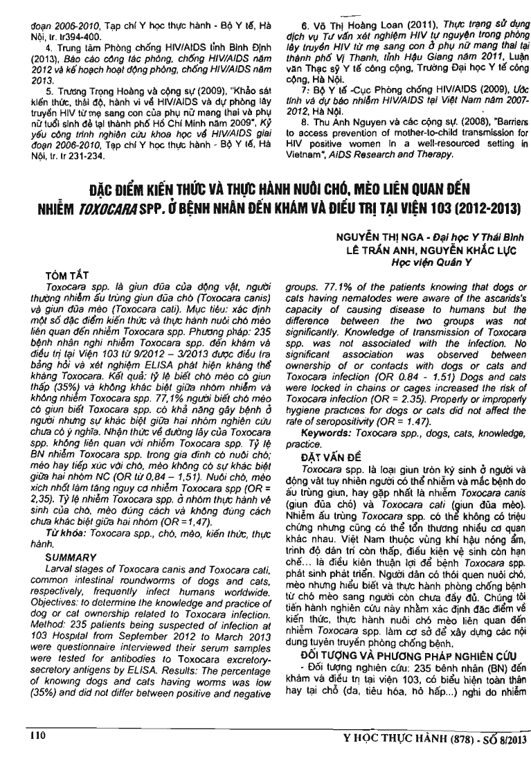 Larval stages of Toxocara canis and Toxocara cati, common intestinal roundworms of dogs and cats, respectively, frequently infect humans worldwide. Objectives: to determine the knowledge and practice of dog or cat ownership related to Toxocara infection. Method: 235 patients being suspected of infection at 103 Hospital from September 2012 to March 2013 were questionnaire interviewed their serum samples were tested for antibodies to Toxocara excretorysecretory antigens by ELISA. Results: The percentage of knowing dogs and cats having worms was low (35 percent) and did not differ between positive and negative groups. 77.1 percent of the patients knowing that dogs or cats having nematodes were aware of the ascarids's capacity of causing disease to humans but the difference between the two groups was not significantly. Knowledge of transmission of Toxocara spp. was not associated with the infection. No significant association was observed between ownership of or contacts with dogs or cats and Toxocara infection (OR 0.84 - 1.51) Dogs and cats were locked in chains or cages increased the risk of Toxocara infection (OR = 2.35). Properly or improperly hygiene practices for dogs or cats did not affect the rate of seropositivity (OR = 1.47).