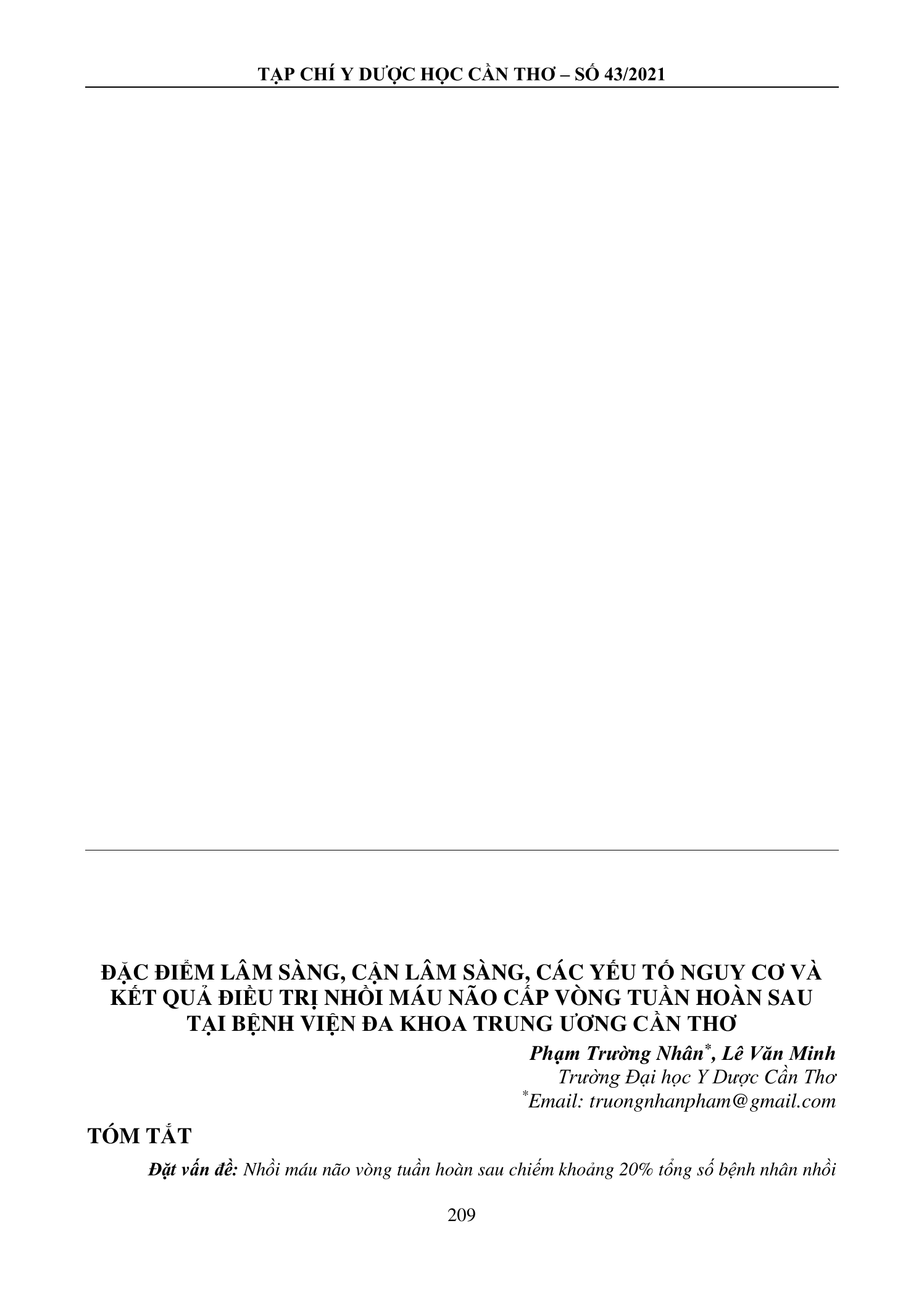 Nhồi máu não vòng tuần hoàn sau chiếm khoảng 20% tổng số bệnh nhân nhồi máu não. Sự đa dạng về triệu chứng lâm sàng, đánh giá, chẩn đoán và điều trị tạo ra thách thức cho các bác sĩ. Mục tiêu nghiên cứu: Mô tả một số đặc điểm lâm sàng, cận lâm sàng, yếu tố nguy cơ và kết quả điều trị bệnh nhân nhồi máu não cấp vòng tuần hoàn sau. Đối tượng và phương pháp nghiên cứu: Nghiên cứu mô tả cắt ngang 30 bệnh nhân nhồi máu não cấp vòng tuần hoàn sau được điều trị tại khoa Nội Thần kinh Bệnh viện Đa khoa Trung ương Cần Thơ từ tháng 12/2019 đến tháng 12/2020. Kết quả: Các biểu hiện lâm sàng và cận lâm sàng thường gặp của nhồi máu não vòng tuần hoàn sau là yếu chi 50%, chóng mặt 40%, nói khó 23,3% và rung giật nhãn cầu 16,7%, 20% bệnh nhân có tiền sử cơn thoáng thiếu máu não, tổn thương chủ yếu vùng cấp máu các nhánh xuyên cầu não 43,3%, động mạch tiểu não trên 30%. Kết quả điều trị 70% bệnh nhân có khiếm khuyết chức năng nhẹ, 23,3% bệnh nhân khiếm khuyết chức năng nặng, 6,7% bệnh nhân tử vong. Kết luận: Nhồi máu não vòng tuần hoàn sau có biểu hiện đa dạng, gây thách thức cho chẩn đoán xác định.