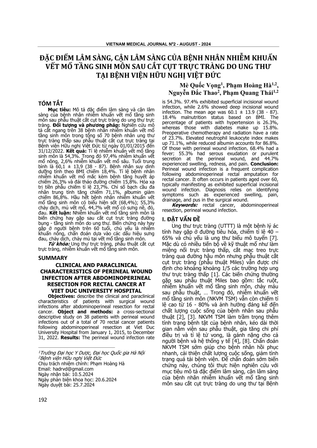 Mô tả đặc điểm lâm sàng và cận lâm sàng của bệnh nhân nhiễm khuẩn vết mổ tầng sinh môn sau phẫu thuật cắt cụt trực tràng do ung thư trực tràng. Đối tượng và phương pháp: Nghiên cứu mô tả cắt ngang trên 38 bệnh nhân nhiễm khuẩn vết mổ tầng sinh môn trong tổng số 70 bệnh nhân ung thư trực tràng thấp sau phẫu thuật cắt cụt trực tràng tại Bệnh viện Hữu nghị Việt Đức từ ngày 01/01/2015 đến 31/12/2022. Kết quả: Tỉ lệ nhiễm khuẩn vết mổ tầng sinh môn là 54,3%. Trong đó 97,4% nhiễm khuẩn vết mổ nông, 2,6% nhiễm khuẩn vết mổ sâu. Tuổi trung bình là 60,1 ± 13,9 (38 - 87). Bệnh nhân suy dinh dưỡng tính theo BMI chiếm 18,4%. Tỉ lệ bệnh nhân nhiễm khuẩn vết mổ mắc kèm bệnh tăng huyết áp chiếm 26,3% và đái tháo đường chiếm 15,8%. Hóa xạ trị tiền phẫu chiếm tỉ lệ 23,7%. Chỉ số bạch cầu đa nhân trung tính tăng chiếm 71,1%, albumin giảm chiếm 86,8%. Hầu hết bệnh nhân nhiễm khuẩn vết mổ tầng sinh môn có biểu hiện sốt (68,4%); 55,3% chảy dịch, mủ vết mổ, 44,7% vết mổ có sưng nề, đỏ, đau. Kết luận: Nhiễm khuẩn vết mổ tầng sinh môn là biến chứng hay gặp sau cắt cụt trực tràng đường bụng - tầng sinh môn do ung thư. Biến chứng này hay gặp ở người bệnh trên 60 tuổi, chủ yếu là nhiễm khuẩn nông, chẩn đoán dựa vào các dấu hiệu sưng đau, chảy dịch, chảy mủ tại vết mổ tầng sinh môn.
