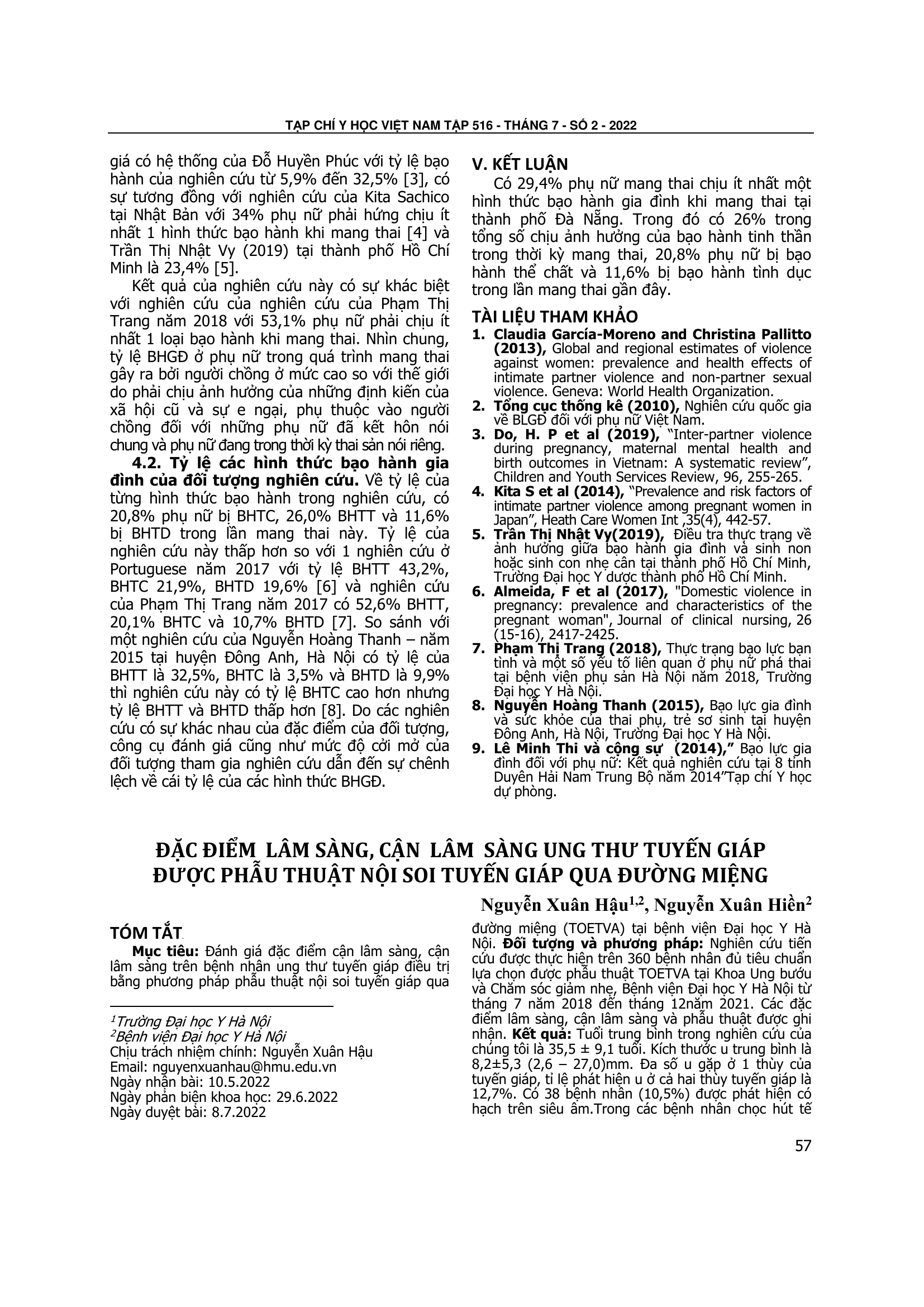 Đánh giá đặc điểm cận lâm sàng, cận lâm sàng trên bệnh nhân ung thư tuyến giáp điều trị bằng phương pháp phẫu thuật nội soi tuyến giáp qua đường miệng (TOETVA) tại bệnh viện Đại học Y Hà Nội. Đối tượng và phương pháp: Nghiên cứu tiến cứu được thực hiện trên 360 bệnh nhân đủ tiêu chuẩn lựa chọn được phẫu thuật TOETVA tại Khoa Ung bướu và Chăm sóc giảm nhẹ, Bệnh viện Đại học Y Hà Nội từ tháng 7 năm 2018 đến tháng 12năm 2021. Các đặc điểm lâm sàng, cận lâm sàng và phẫu thuật được ghi nhận. Kết quả: Tuổi trung bình trong nghiên cứu của chúng tôi là 35,5 ± 9,1 tuổi. Kích thước u trung bình là 8,2±5,3 (2,6 – 27,0)mm. Đa số u gặp ở 1 thùy của tuyến giáp, tỉ lệ phát hiện u ở cả hai thùy tuyến giáp là 12,7%. Có 38 bệnh nhân (10,5%) được phát hiện có hạch trên siêu âm.Trong các bệnh nhân chọc hút tế bào kim nhỏ 71,9% có kết quả là ung thư tuyến giáp hoặc nghi ngờ ung thư tuyến giáp. 16,1% cắt tuyến giáp toàn bộ, 83,9% cắt thuỳ và eo tuyến giáp, vét hạch cổ trung tâm dự phòng. TOETVA có thời gian phẫu thuật trung bình là 96,7±24,9. Kết luận: TOETVA được ứng dụng ở những bệnh nhân ung thư tuyến giáp giai đoạn sớm.