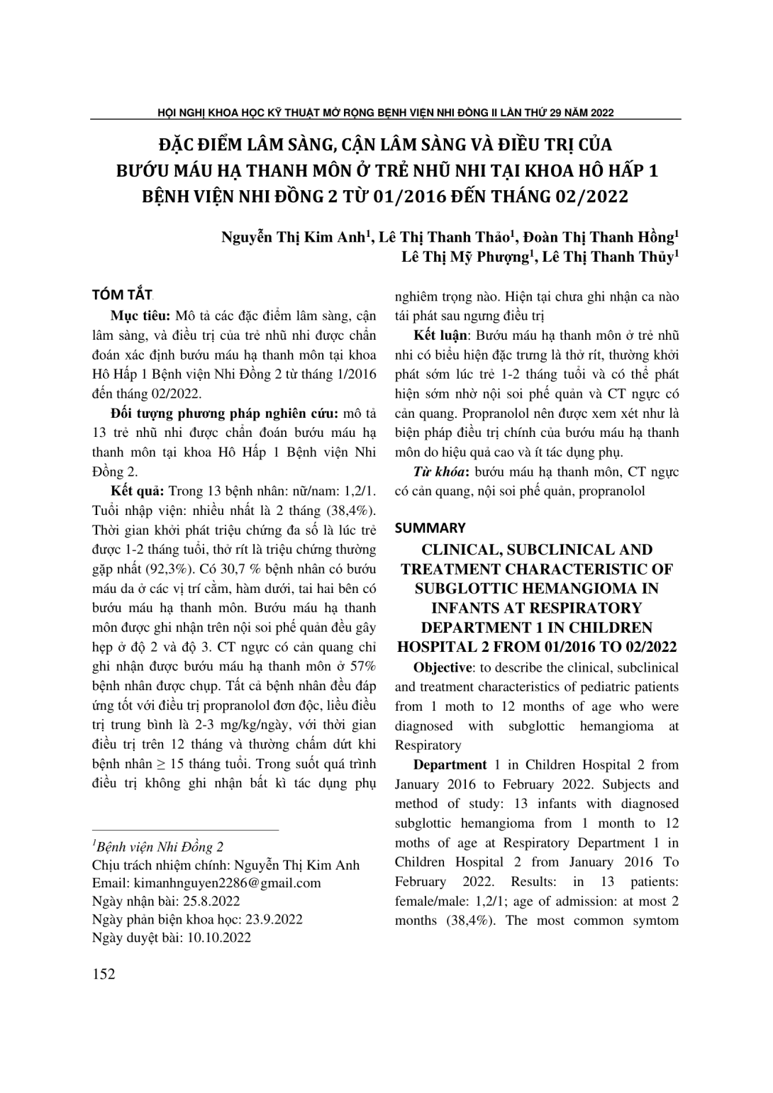 Mô tả các đặc điểm lâm sàng, cận lâm sàng, và điều trị của trẻ nhũ nhi được chẩn đoán xác định bướu máu hạ thanh môn tại khoa Hô Hấp 1 Bệnh viện Nhi Đồng 2 từ tháng 1/2016 đến tháng 02/2022. Đối tượng phương pháp nghiên cứu: mô tả 13 trẻ nhũ nhi được chẩn đoán bướu máu hạ thanh môn tại khoa Hô Hấp 1 Bệnh viện Nhi Đồng 2. Kết quả: Trong 13 bệnh nhân: nữ/nam: 1,2/1. Tuổi nhập viện: nhiều nhất là 2 tháng (38,4%). Thời gian khởi phát triệu chứng đa số là lúc trẻ được 1-2 tháng tuổi, thở rít là triệu chứng thường gặp nhất (92,3%). Có 30,7 % bệnh nhân có bướu máu da ở các vị trí cằm, hàm dưới, tai hai bên có bướu máu hạ thanh môn. Bướu máu hạ thanh môn được ghi nhận trên nội soi phế quản đều gây hẹp ở độ 2 và độ 3. CT ngực có cản quang chỉ ghi nhận được bướu máu hạ thanh môn ở 57% bệnh nhân được chụp. Tất cả bệnh nhân đều đáp ứng tốt với điều trị propranolol đơn độc, liều điều trị trung bình là 2-3 mg/kg/ngày, với thời gian điều trị trên 12 tháng và thường chấm dứt khi bệnh nhân ≥ 15 tháng tuổi. Trong suốt quá trình điều trị không ghi nhận bất kì tác dụng phụ nghiêm trọng nào. Hiện tại chưa ghi nhận ca nào tái phát sau ngưng điều trị Kết luận: Bướu máu hạ thanh môn ở trẻ nhũ nhi có biểu hiện đặc trưng là thở rít, thường khởi phát sớm lúc trẻ 1-2 tháng tuổi và có thể phát hiện sớm nhờ nội soi phế quản và CT ngực có cản quang. Propranolol nên được xem xét như là biện pháp điều trị chính của bướu máu hạ thanh môn do hiệu quả cao và ít tác dụng phụ.