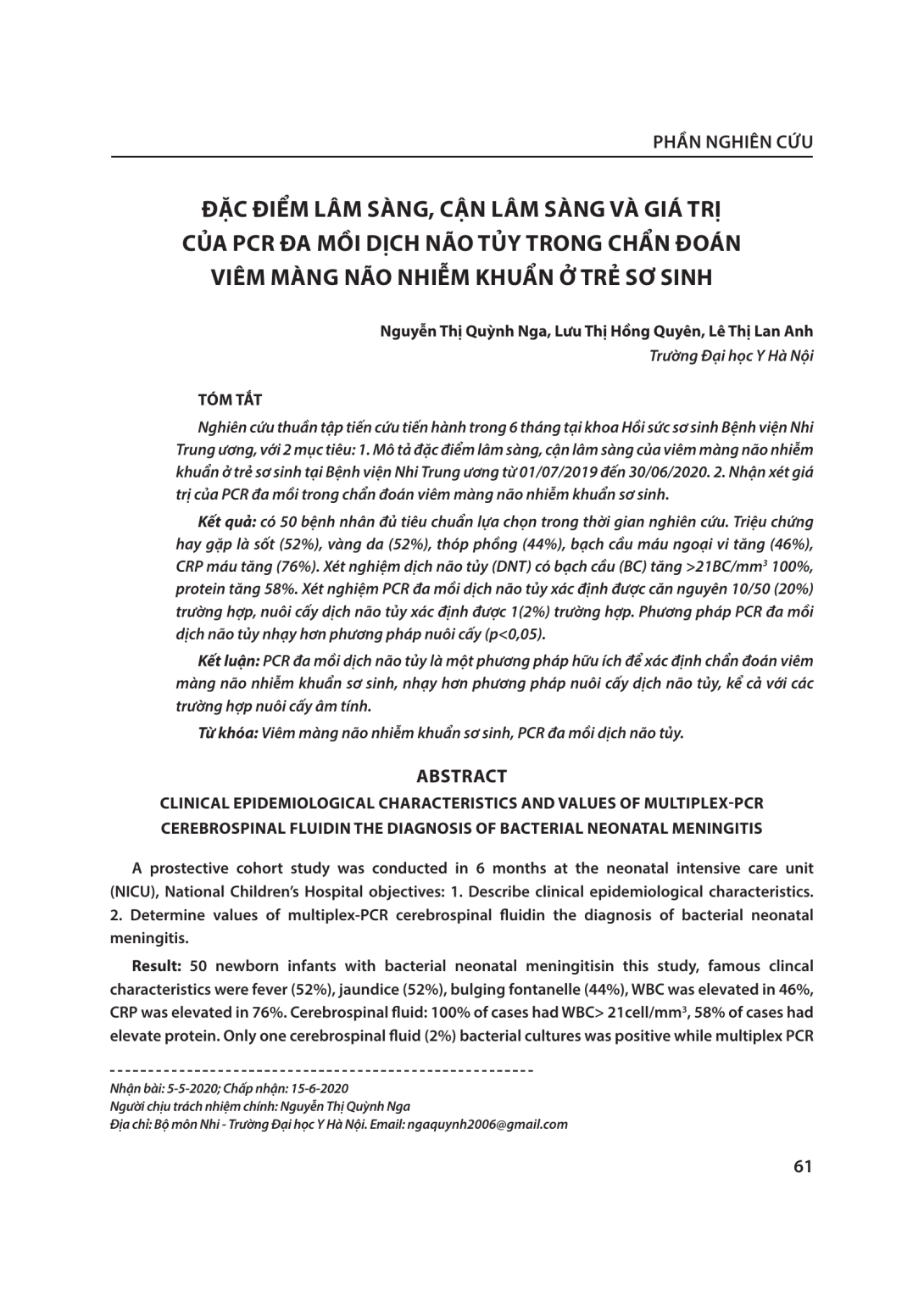 Nghiên cứu thuần tập tiến cứu tiến hành trong 6 tháng tại khoa Hồi sức sơ sinh Bệnh viện Nhi Trung ương, với 2 mục tiêu 1. Mô tả đặc điểm lâm sàng, cận lâm sàng của viêm màng não nhiễm khuẩn ở trẻ sơ sinh tại Bệnh viện Nhi Trung ương từ 01/07/2019 đến 30/06/2020. 2. Nhận xét giá trị của PCR đa mồi trong chẩn đoán viêm màng não nhiễm khuẩn sơ sinh. Kết quả có 50 bệnh nhân đủ tiêu chuẩn lựa chọn trong thời gian nghiên cứu. Triệu chứng hay gặp là sốt (52%), vàng da (52%), thóp phồng (44%), bạch cầu máu ngoại vi tăng (46%), CRP máu tăng (76%). Xét nghiệm dịch não tủy (DNT) có bạch cầu (BC) tăng >21BC/mm3 100%, protein tăng 58%. Xét nghiệm PCR đa mồi dịch não tủy xác định được căn nguyên 10/50 (20%) trường hợp, nuôi cấy dịch não tủy xác định được 1(2%) trường hợp. Phương pháp PCR đa mồi dịch não tủy nhạy hơn phương pháp nuôi cấy (p<0,05). Kết luận PCR đa mồi dịch não tủy là một phương pháp hữu ích để xác định chẩn đoán viêm màng não nhiễm khuẩn sơ sinh, nhạy hơn phương pháp nuôi cấy dịch não tủy, kể cả với các trường hợp nuôi cấy âm tính.
