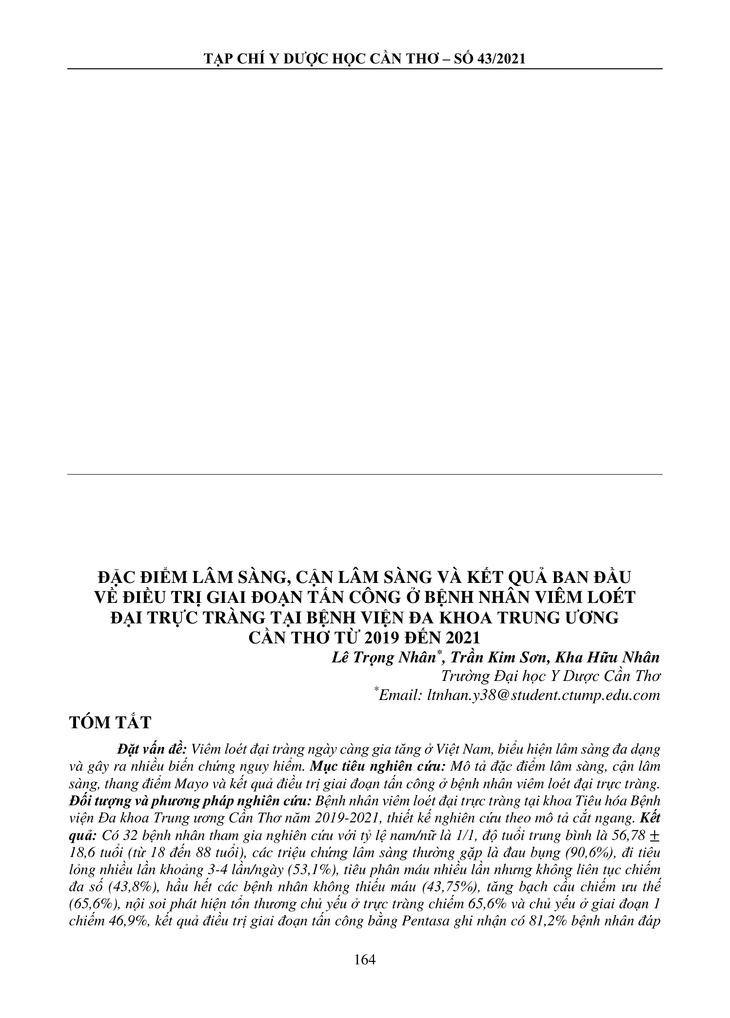 Viêm loét đại tràng ngày càng gia tăng ở Việt Nam, biểu hiện lâm sàng đa dạng và gây ra nhiều biến chứng nguy hiểm. Mục tiêu nghiên cứu: Mô tả đặc điểm lâm sàng, cận lâm sàng, thang điểm Mayo và kết quả điều trị giai đoạn tấn công ở bệnh nhân viêm loét đại trực tràng. Đối tượng và phương pháp nghiên cứu: Bệnh nhân viêm loét đại trực tràng tại khoa Tiêu hóa Bệnh viện Đa khoa Trung ương Cần Thơ năm 2019-2021, thiết kế nghiên cứu theo mô tả cắt ngang. Kết quả: Có 32 bệnh nhân tham gia nghiên cứu với tỷ lệ nam/nữ là 1/1, độ tuổi trung bình là 56,78 ± 18,6 tuổi (từ 18 đến 88 tuổi), các triệu chứng lâm sàng thường gặp là đau bụng (90,6%), đi tiêu lỏng nhiều lần khoảng 3-4 lần/ngày (53,1%), tiêu phân máu nhiều lần nhưng không liên tục chiếm đa số (43,8%), hầu hết các bệnh nhân không thiếu máu (43,75%), tăng bạch cầu chiếm ưu thế (65,6%), nội soi phát hiện tổn thương chủ yếu ở trực tràng chiếm 65,6% và chủ yếu ở giai đoạn 1 chiếm 46,9%, kết quả điều trị giai đoạn tấn công bằng Pentasa ghi nhận có 81,2% bệnh nhân đáp ứng điều trị giai đoạn tấn công. Kết luận: Bệnh nhân viêm loét đại trực tràng có biểu hiện lâm sàng và cận lâm sàng đa dạng và tỷ lệ đáp ứng điều trị giai đoạn tấn công cao